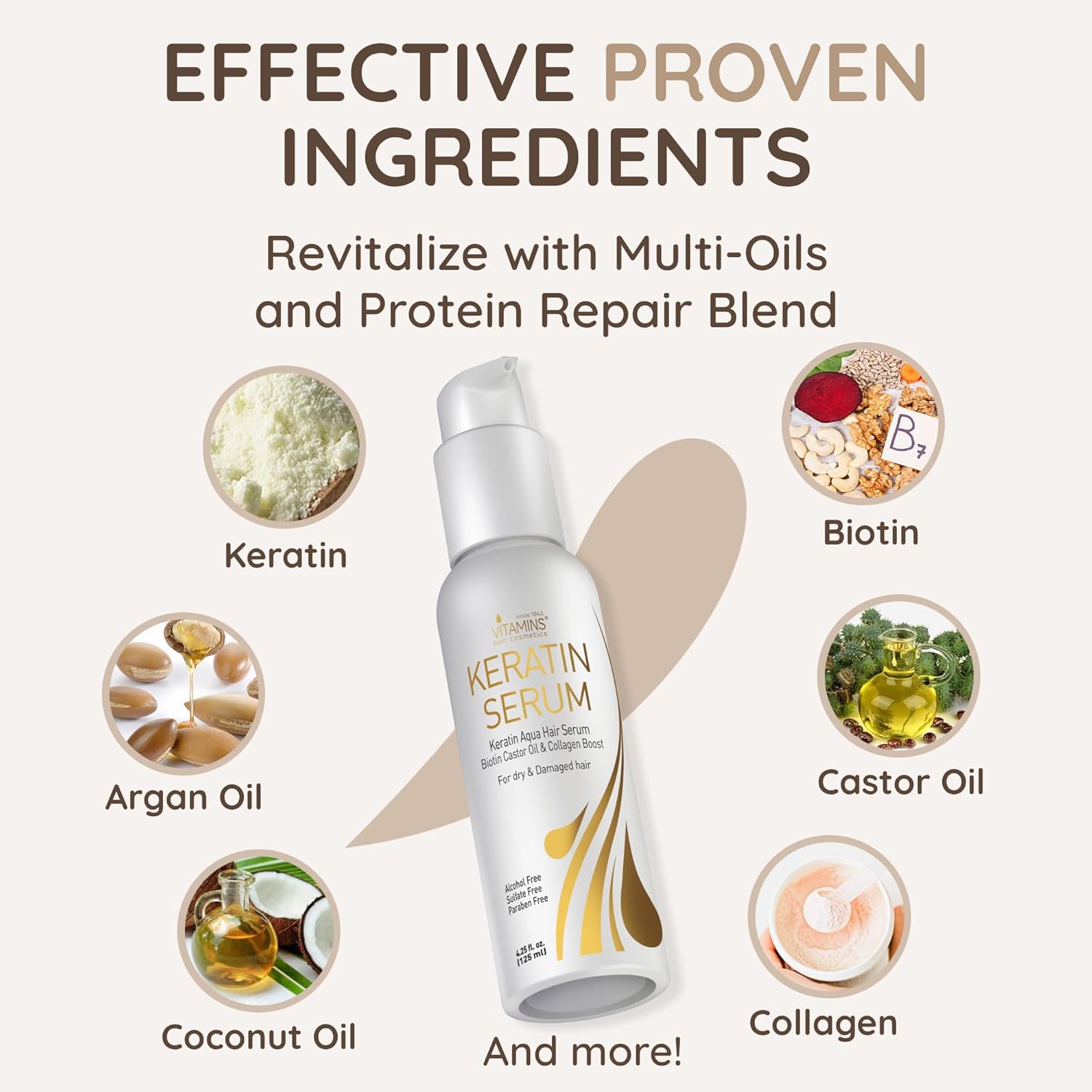 VITAMINS hair cosmetics Keratin Hair Serum for Frizzy and Damaged Hair - Anti Frizz Serum with Biotin, Castor Oil & Collagen for Heat Protection, Shine and Gloss Treatment - 4.25 Fl Oz