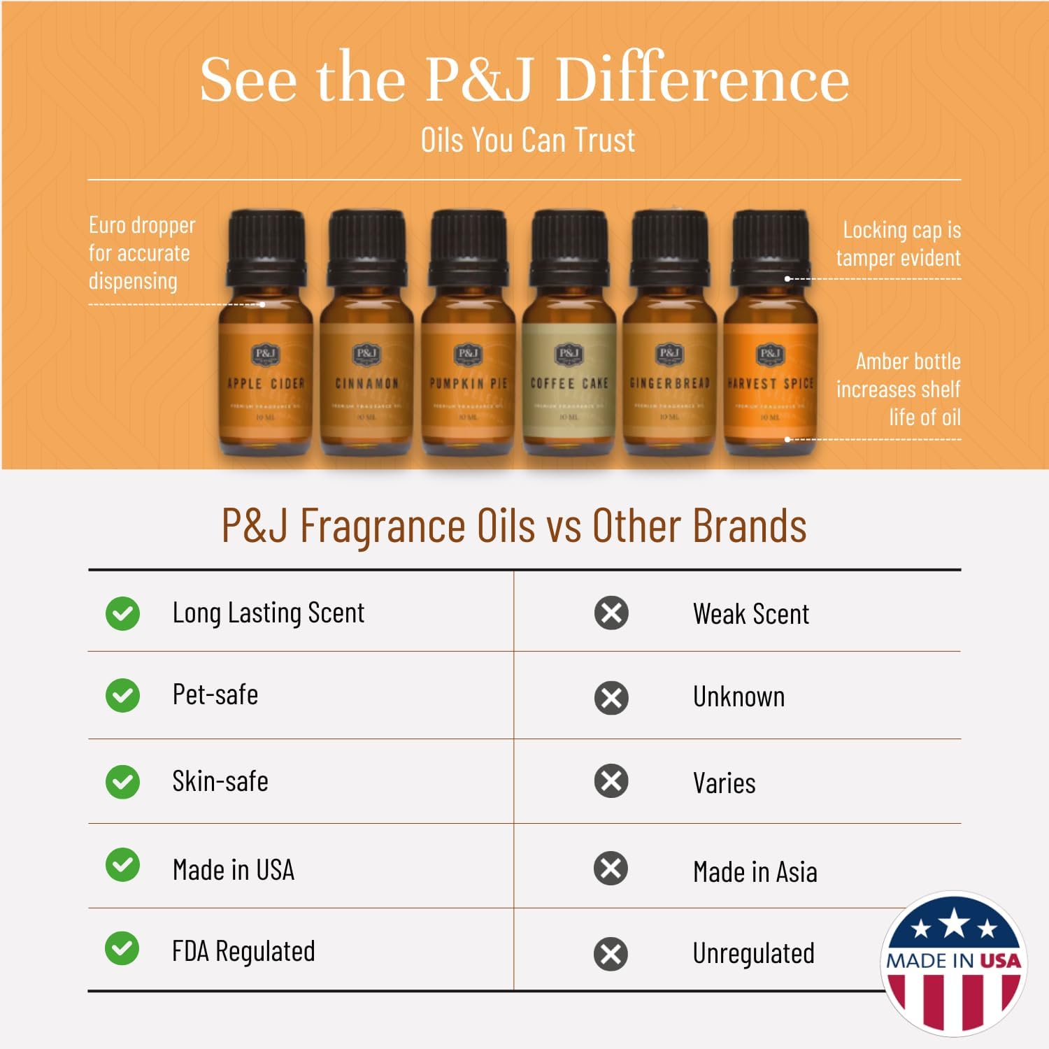 - Premium Grade: P&J fragrances oils are highly concentrated with a strong scent. With more than 30 years in the industry, these enhanced formulations were developed by our IFRA certified master perfumers. Our oils are safe and ideal for every home.