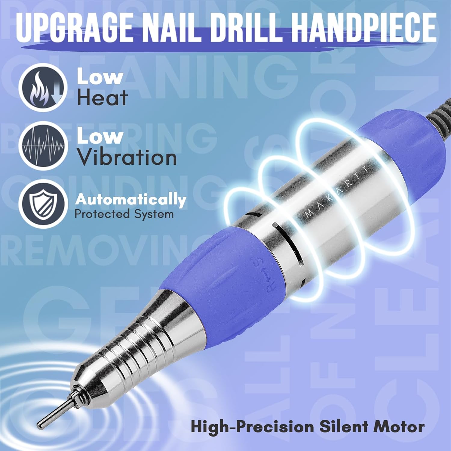 - Lightweight and Low Heat Handpiece: The handpiece is designed with heat dissipation device interior and ventilation holes exterior to prevent the handpiece from overheating even at high speed; The strong bearing makes sure the drill bit spin with low vibration, doing less harm to your nails.