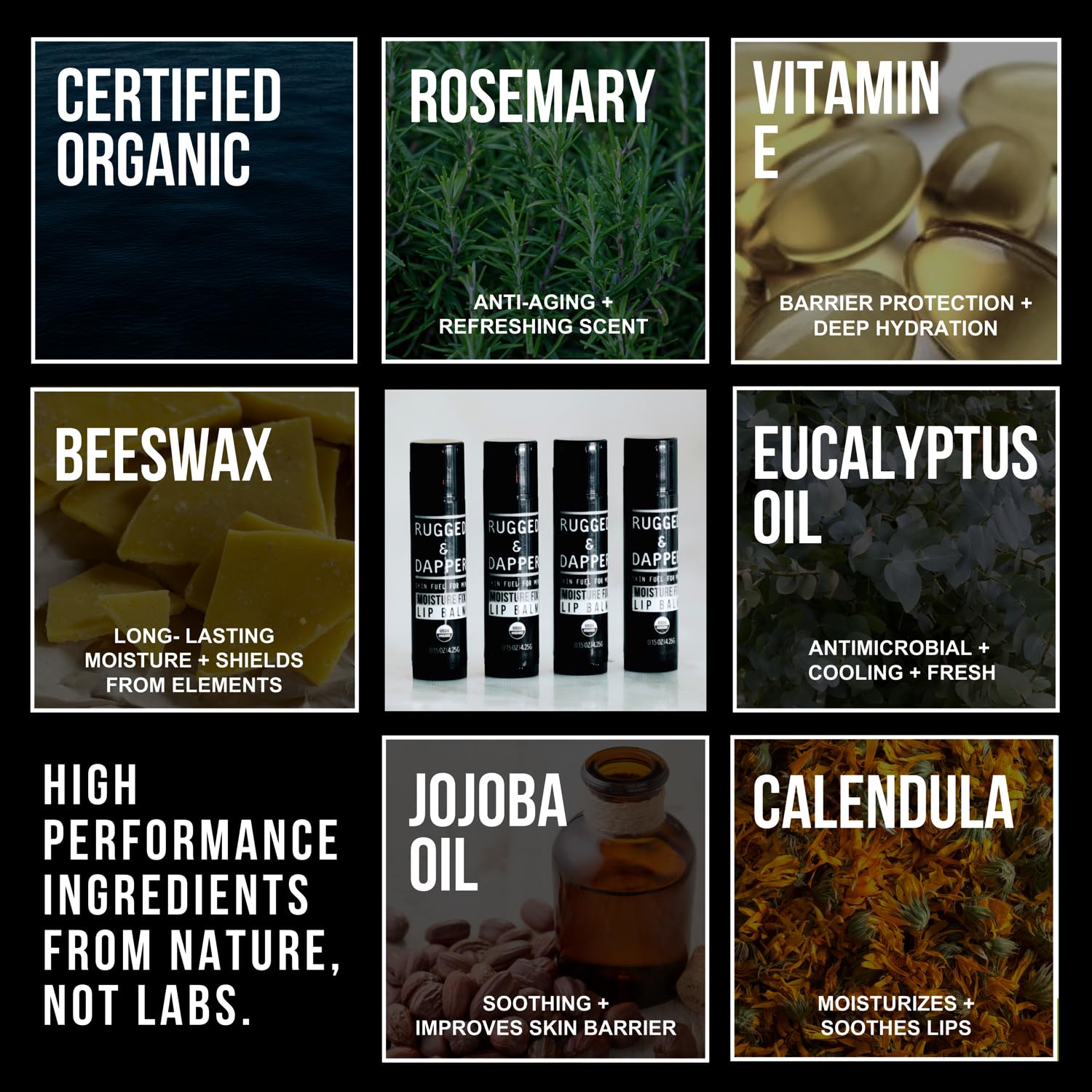 RUGGED & DAPPER Lip Balm for Men - Certified Organic + Natural Ingredients - 4 Pack - Hydrating Mens Chapstick - USA Made
