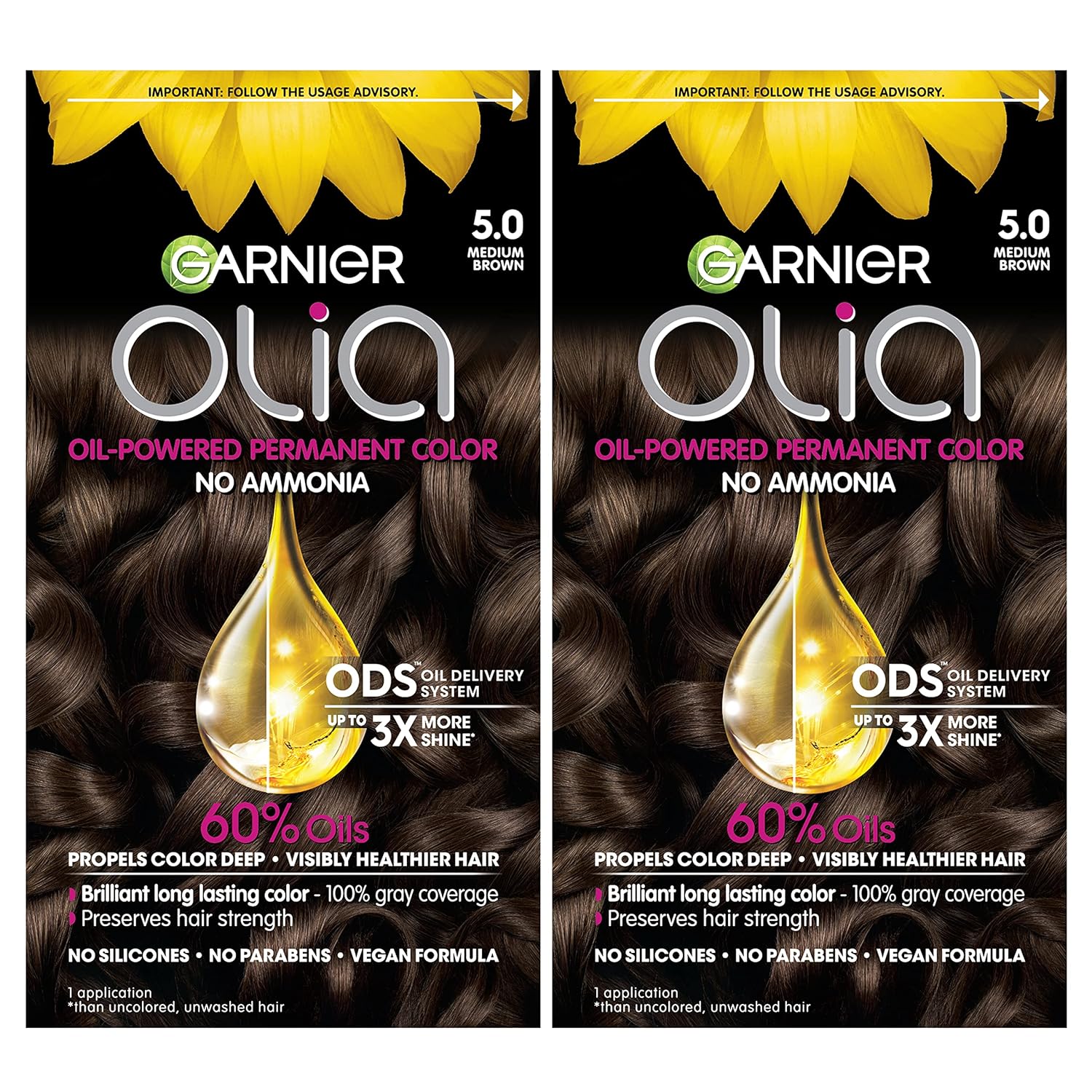 Garnier Hair Color Olia Ammonia-Free Brilliant Color Oil-Rich Permanent Hair Dye, 5.0 Medium Brown, 2 Count (Packaging May Vary)