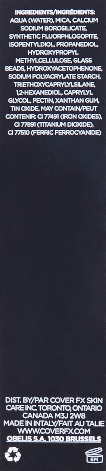 - Ingredients: Water/Aqua/Eau, Mica, Calcium Sodium Borosilicate, Synthetic Fluorphlogopite, Isopentyldiol, Propanediol, Hydroxypropyl Methylcellulose, Glass Beads, Hydroxyacetophenone, Sodium Polyacrylate Starch, Triethoxycaprylylsilane, 1,2-Hexanediol, Caprylyl Glycol, Pectin, Xanthan Gum, Tin Oxide, May Contain: Ci 77491 (Iron Oxides), Ci 77891 (Titanium Dioxide), Ci 77510 (Ferric Ferrocyanide)