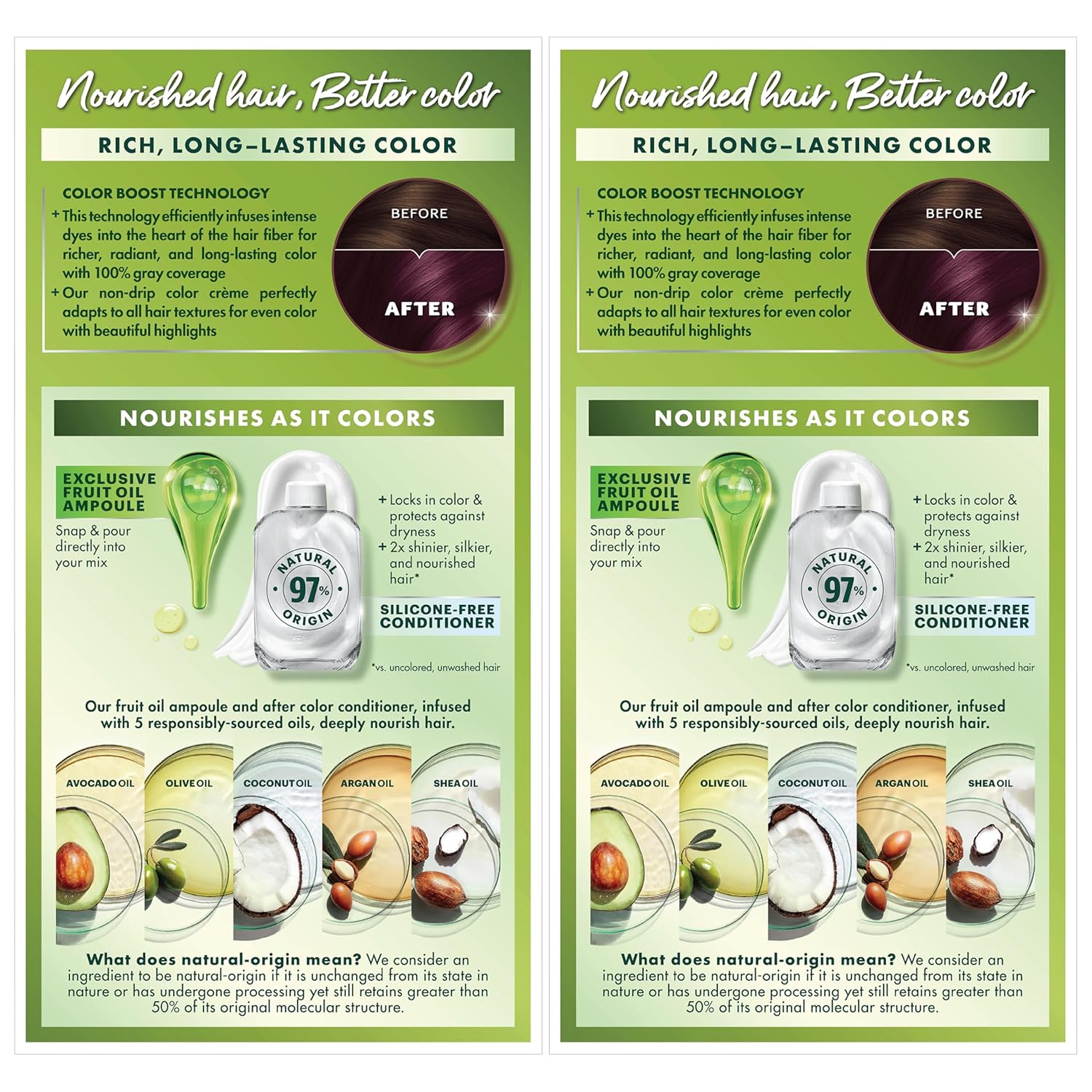 - Hair Dye Kit: The only hair color with a separate fruit oil ampoule that you snap & pour directly into the mix; Follow hair dye with our after color hair conditioner, infused with a blend of 5 fruit oils: avocado, olive, shea, argan & coconut oil