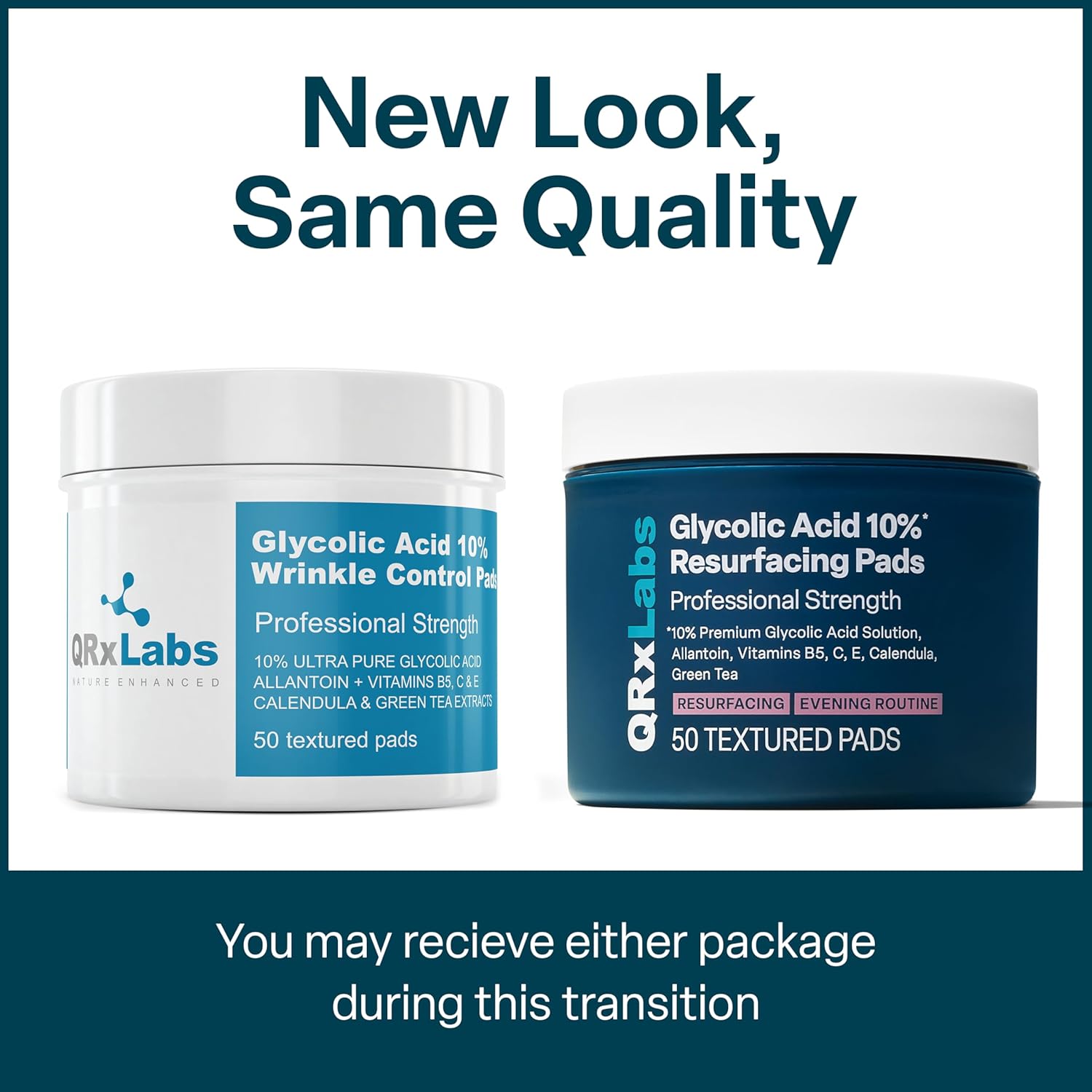 QRxLabs Glycolic Acid Pads - 50-Count Jar, 10% Glycolic Acid - AHA Resurfacing Peel & Exfoliating Face Pads - Alcohol-Free Rinse-Free With Vitamins B5, C & E & Green Tea Extract