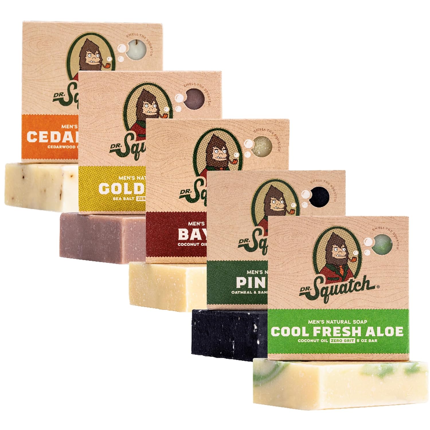 - RAISE THE BAR - Upgrade your shower with our sudstastic soaps featuring Dr. Squatch’s favorite scents: Cool Fresh Aloe, Cedar Citrus, Gold Moss, Pine Tar & Bay Rum (5 oz, 5-Pack)