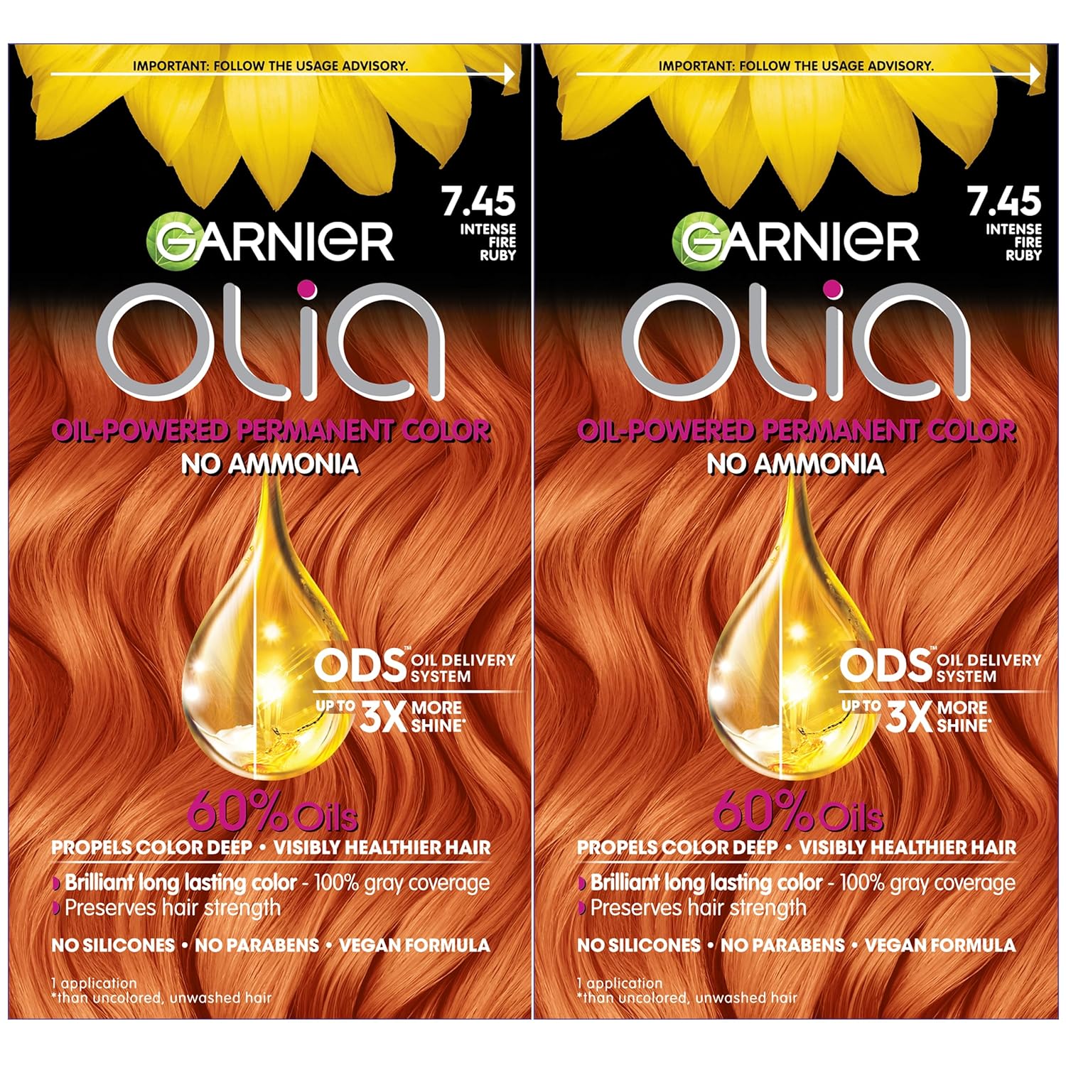 Garnier Hair Color Olia Ammonia-Free Brilliant Color Oil-Rich Permanent Hair Dye, 7.45 Dark Fire Ruby, 2 Count (Packaging May Vary)