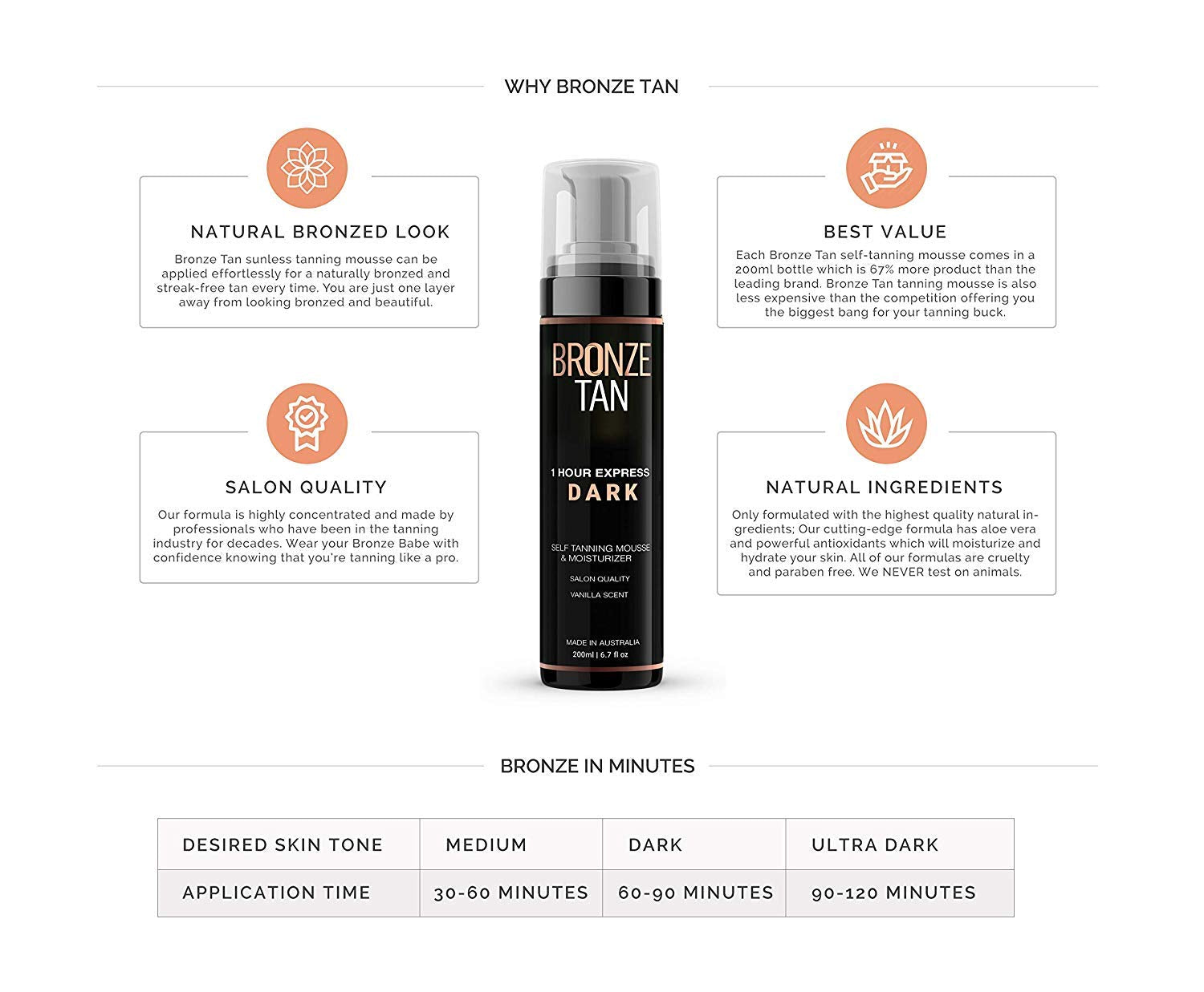 - Natural Ingredients - Our sunless tanning mousse is formulated with only the highest quality natural ingredients. Our cutting edge formula will moisturize and hydrate your skin while giving you a flawless tan.