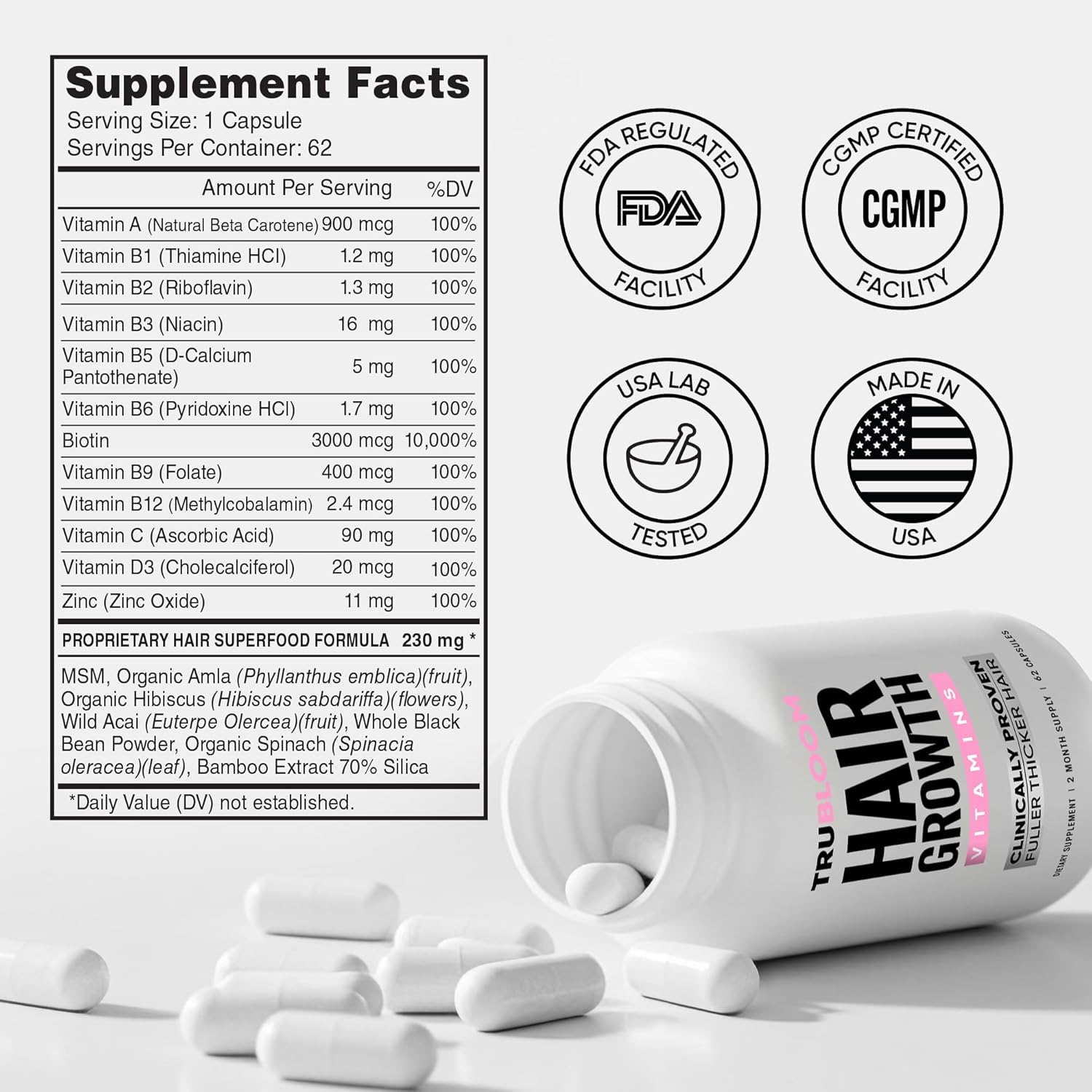 - Love It Or Return It. If For Any Reason You’re Not Delighted With Your Tru Bloom Hair Vitamins, Simply Contact Us Directly Within 100 Days For a Full Refund. Finally, Hair Vitamins For Women and Men, With True Zero-Risk