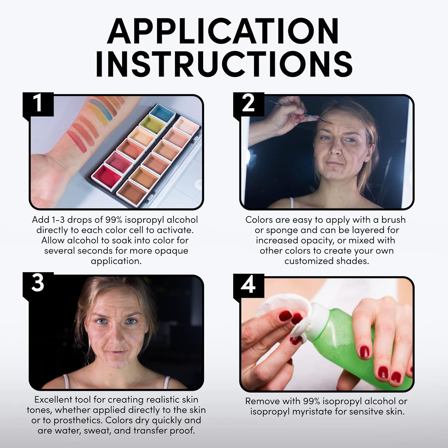 - REALISTIC SFX MAKEUP: Create realistic skin tones and textures, such as wrinkles, scars, and other effects, directly to the skin or prosthetics.