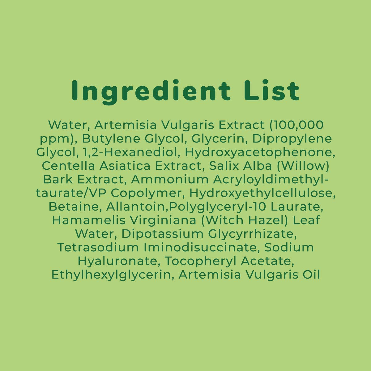 - 💚 ARTEMISIA VULGARIS EXTRACT to calm redness and irritation. Artemisia is known for helping soothe irritation and protect the skin cells from sun damage. Great for all skin types and for when you're skin needs a soothing treat.