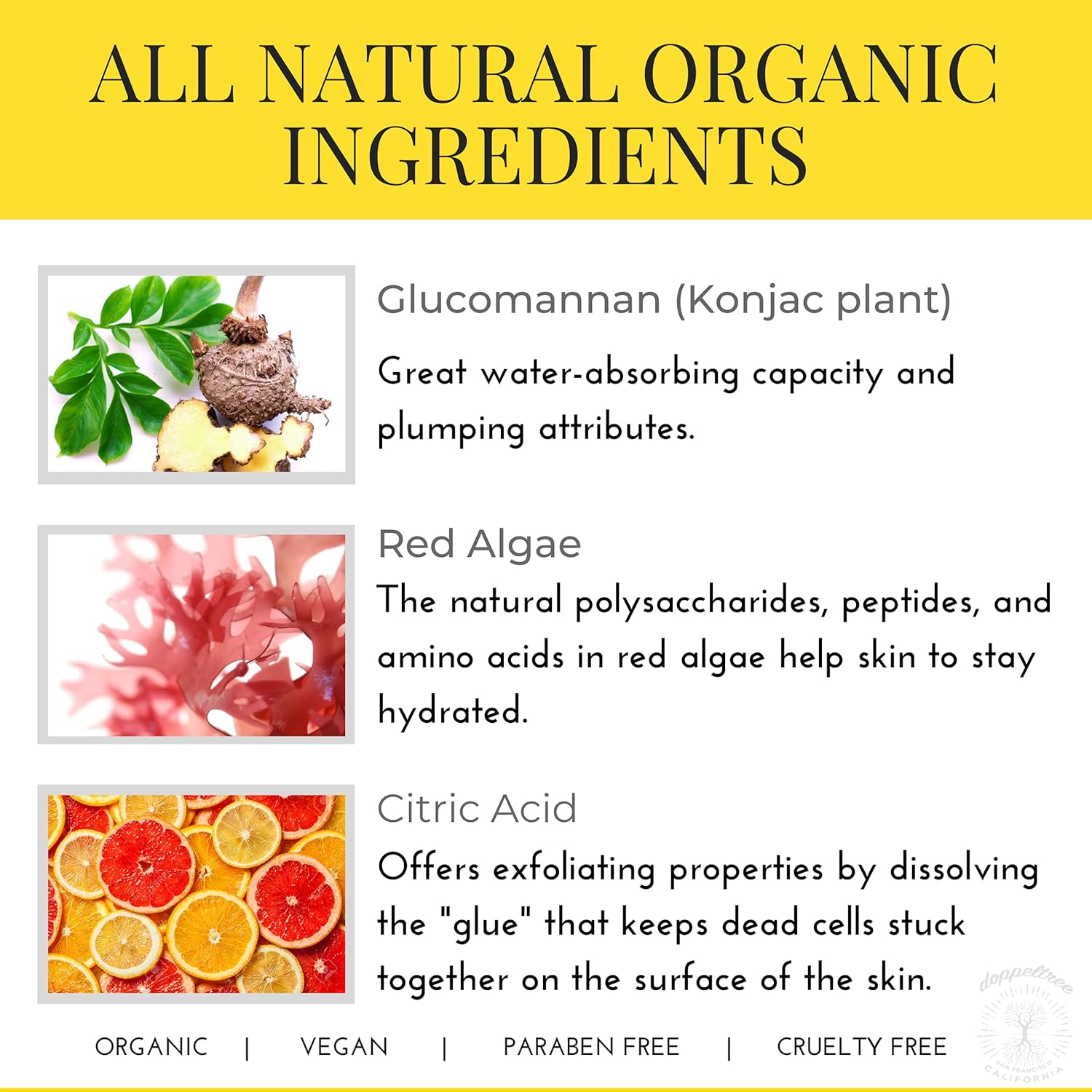 - 🌿 All Natural, Dermatologist Tested: Based in San Francisco, at Doppeltree we’re all about all natural organic ingredients, cruelty free processes, and sustainability. Look your best and feel good about it at the same time.