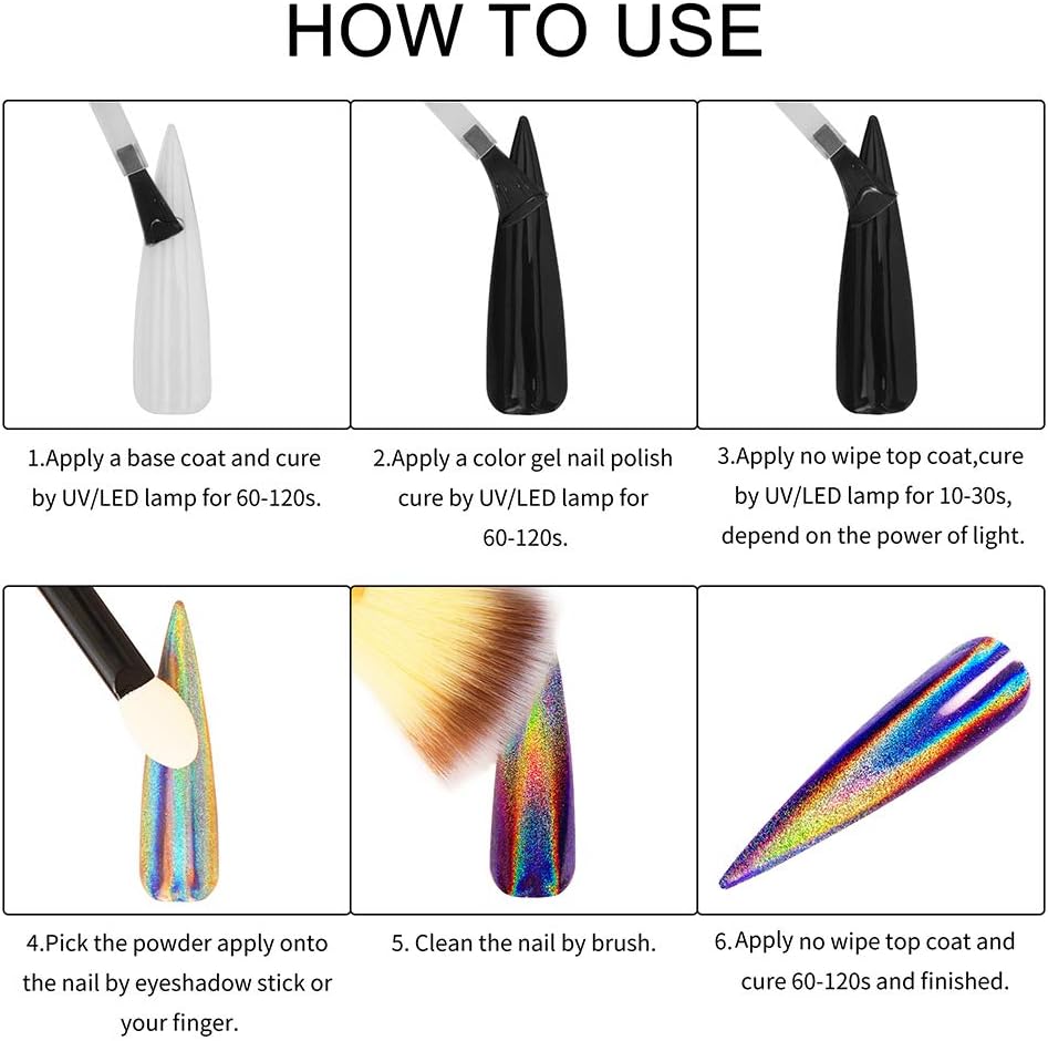 - 【WIDE APPLICATION】:These powders need to be used with Gel nail polish(color gel,gel base coat and glossy gel top coat). Some regular Polish can also be used, but not all. These powders can be used on natural nails, UV gel nails, acrylic nails or false nail tips. You can use them very easily. It is a good solution with rhinestones 、nail art fimo or other accessories to build a nice nail art.