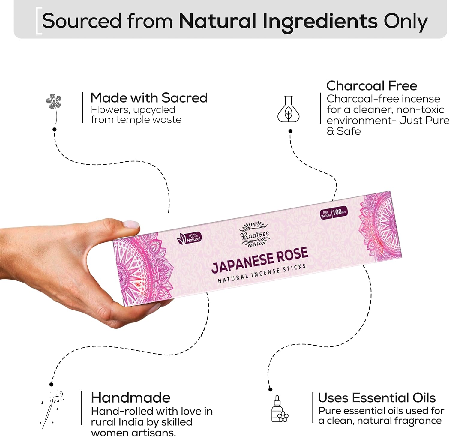 - 100% NATURAL -Raajsee rose incense Sticks are completely handmade MADE FROM SCRATCH by blending natural resins, Herbs, natural incense with aromatic wood powders, charred coconut powder fragrant oils, and honey. No Dipping in Toxic Chemicals, organic incense sticks non toxic
