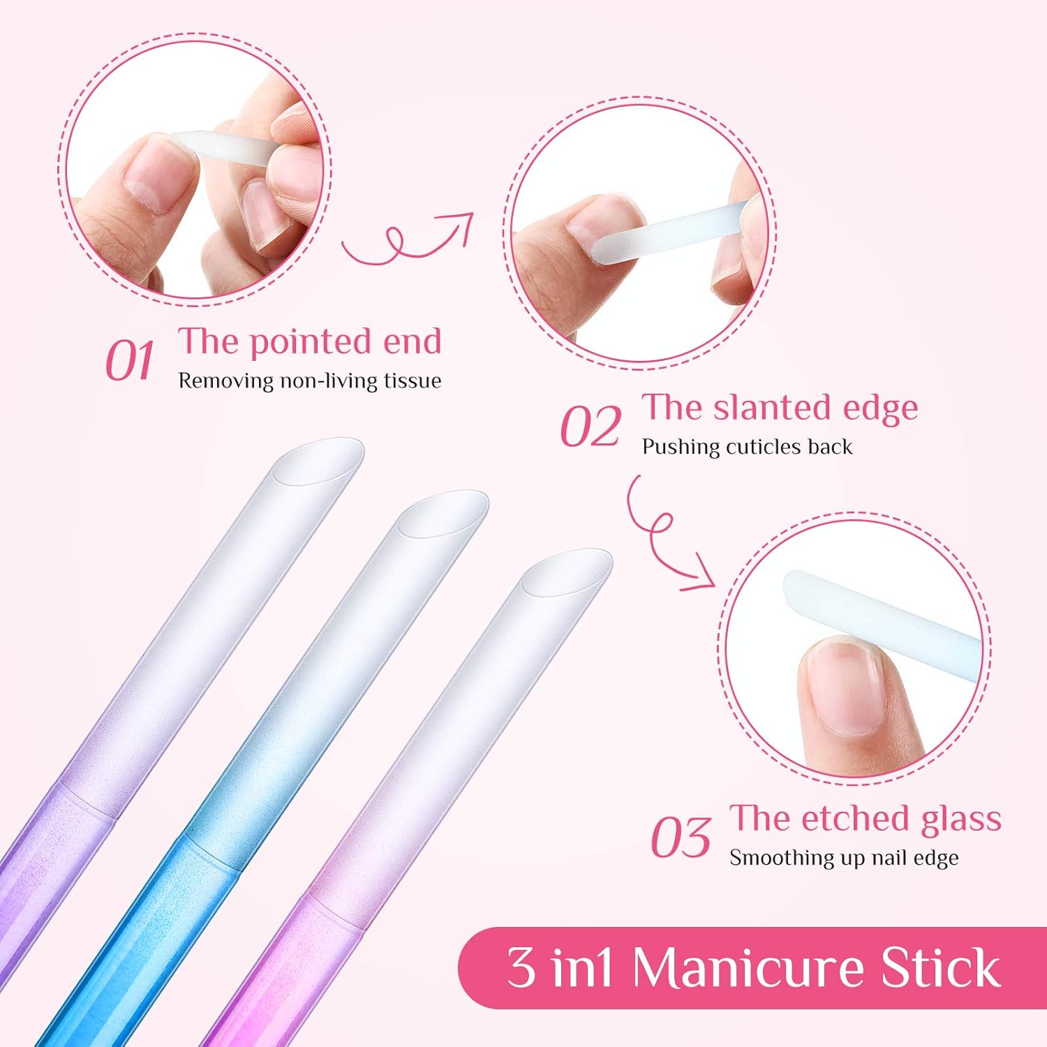- 3 in 1 feature: this double sided glass cuticle pusher is designed for many uses; The pointed tip gently removes dead skin and dirt from nail edges, while the slanted edge is nice for pushing back cuticles and exfoliating under the nail fold; Both sides feature etched glass that smooths nails to a refined shape, promoting the growth of long, healthy, and beautiful nails.