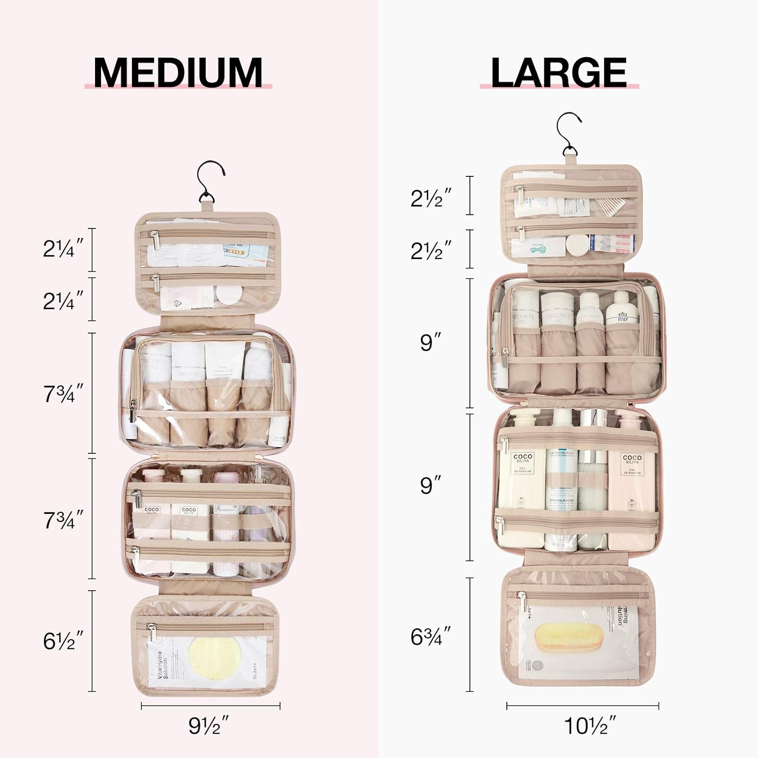 - 𝐋𝐚𝐫𝐠𝐞 𝐂𝐚𝐩𝐚𝐜𝐢𝐭𝐲: Medium size: Rolled - 11'' x 3.7" x 7.9"; Opened - 9.5'' x 4" x 26.5; Large size :Rolled: 12.2'' x 4" x 9"; Opened: 10.5'' x 4" x 29.8. 4 separate compartments with 1 TSA-approved cosmetic bag