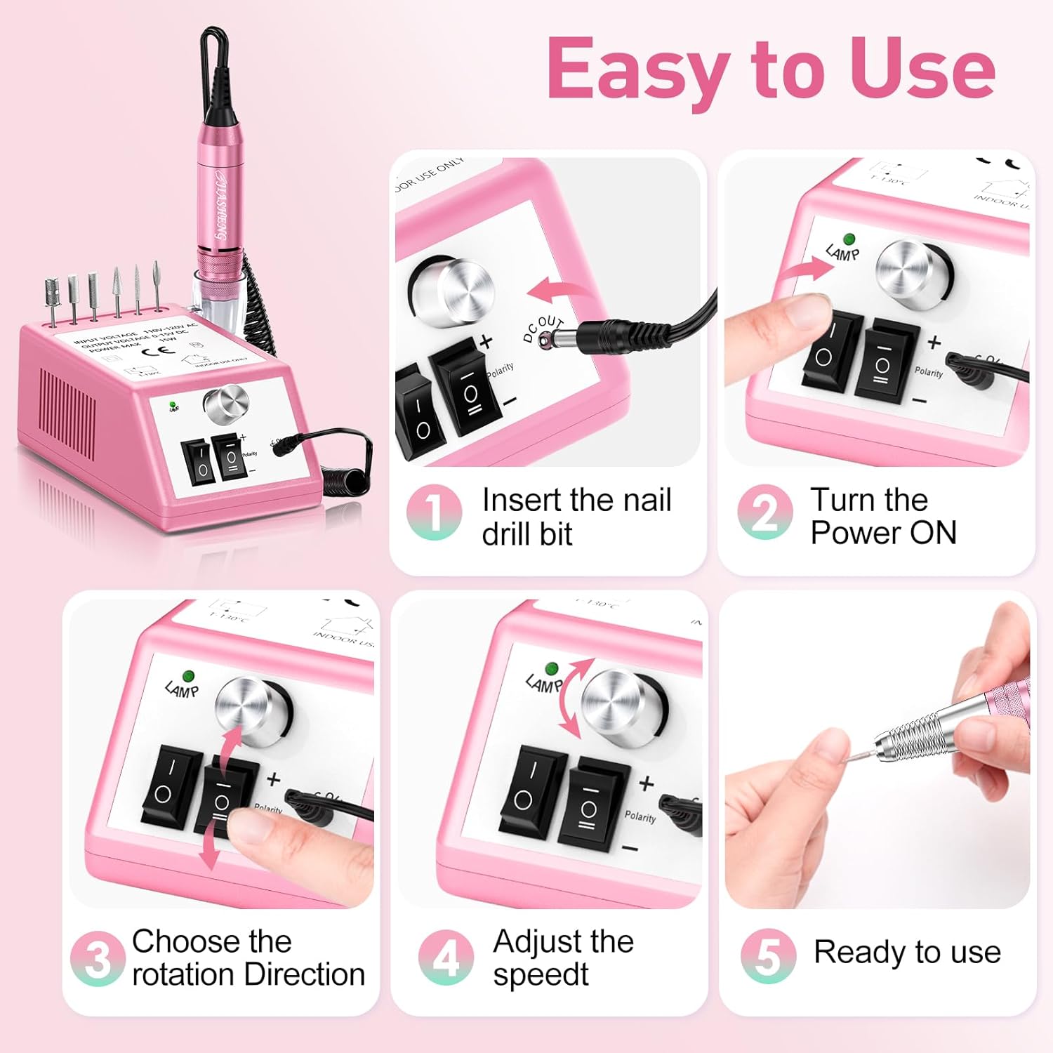 - Efficient Electric Nail Drill: The nail drill is compact enough for your work station, and the nail drill designed with handpiece holder and 6 nail drill bits collector, it is convenient to use and storage. You can put your desired nail drill bits on the machine, and easy to pick it up