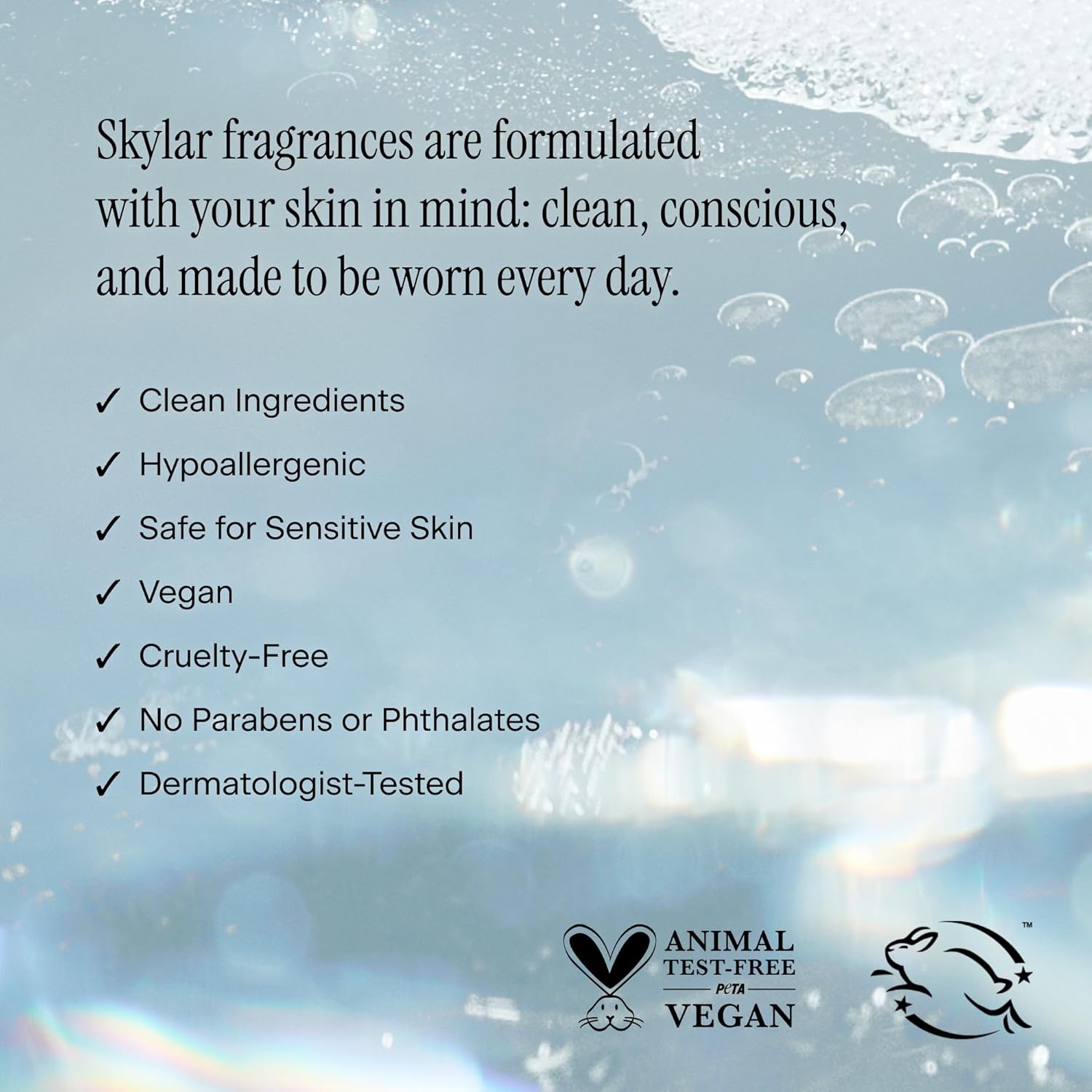 - Clean Fragrance for Women: Skylar's clean beauty perfumes for women are hypoallergenic, vegan, and cruelty-free, ensuring they are safe for sensitive skin. These fragrances are formulated without parabens, phthalates, sulfates, synthetic dyes, or any harmful chemicals, reflecting a commitment to purity and safety.