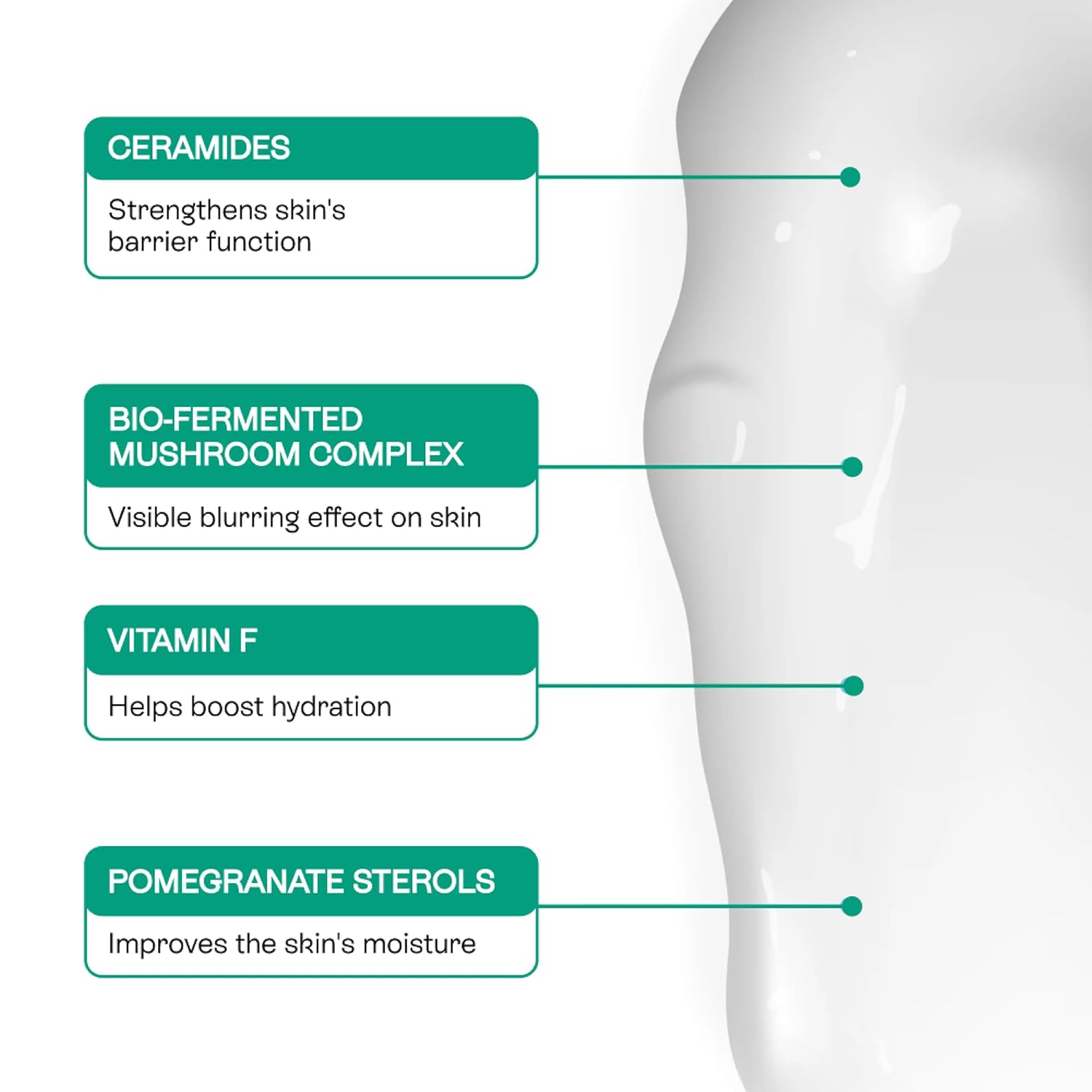 - Key ingredients: Hyaluronic Acid, Bio-fermented Bifidus, Reishi Mushroom Extract, Ceramides, Pomegranate Sterols