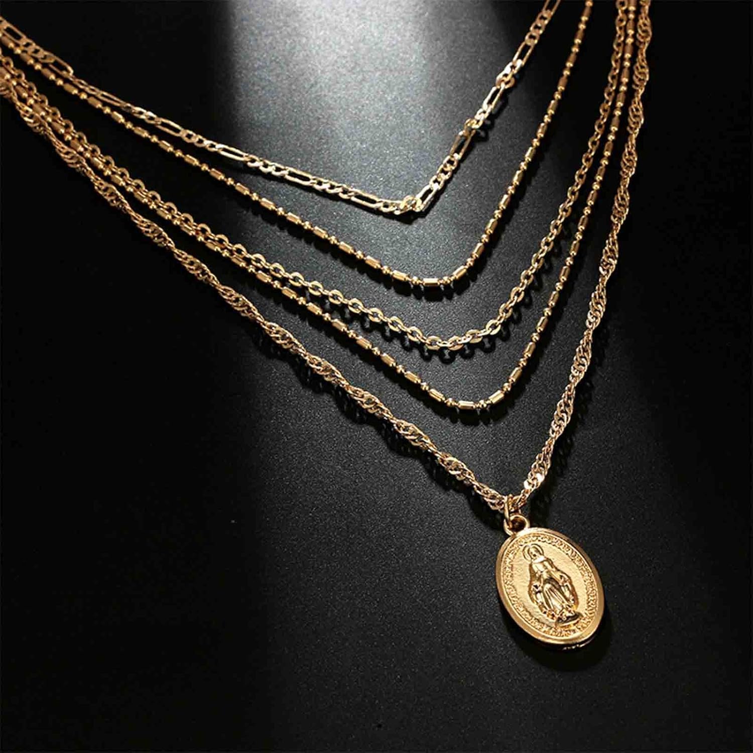 Boho Layered Oval Coin Necklace Choker Gold Virgin Mary Necklace Figaro Chain Necklace Vintage Multilayer Necklace Chain Jewelry for Women and Girls