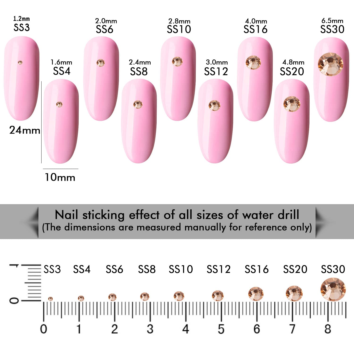 - Different Sizes Available:These rhinestones for crafts come in a wide range of sizes (1.6mm, 2mm, 2.4mm, 2.8mm, 3mm, 4mm, 4.8mm) to suit your different needs