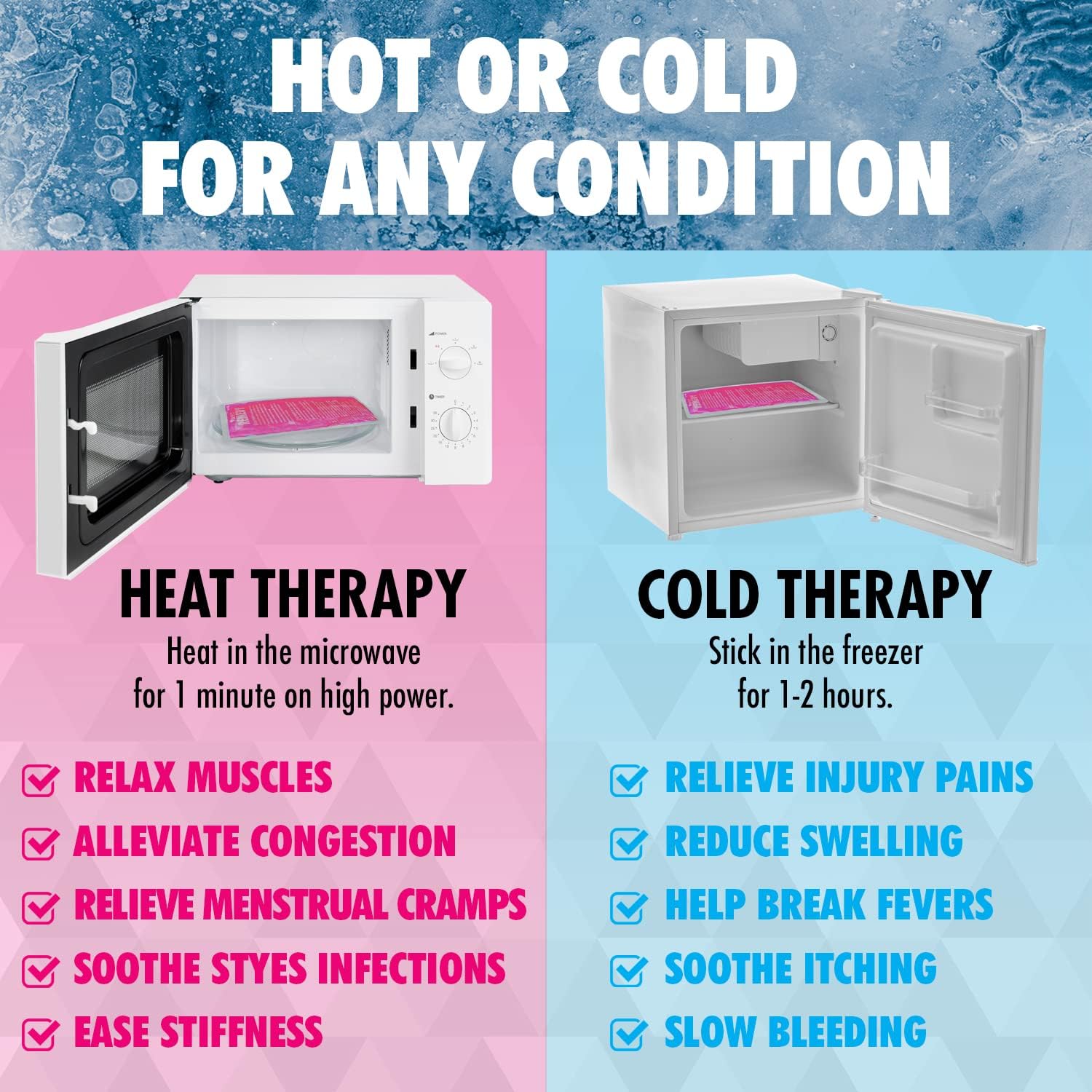 - FOR HOT AND COLD COMPRESS: Struggling with cramps or a stomach ache? Our soft ice packs also work like hot water bottles, providing soothing heat therapy. You can count on our hot and cold pack for pain relief whenever and wherever you need it.
