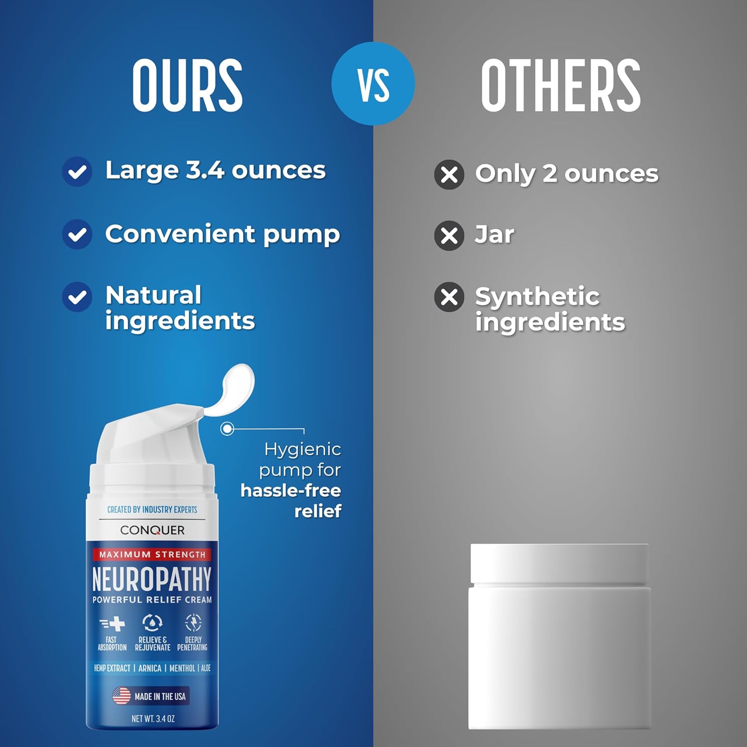 - [GET FAST NATURAL RELIEF]: Discover the power of Conquer Neuropathy Relief Cream for nerve pain with a unique blend of natural ingredients like arnica, hemp, aloe vera, and menthol. This soothing formula delivers quick relief for neuropathy and nerve issues, providing comfort where you need it most.