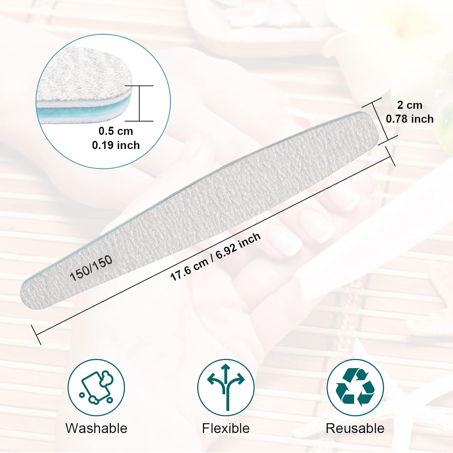 - 150/150 Grit Nail Files: Perfect size of 7.36 x 0.98 x 0.12 inches (18.7*2.5*0.3cm), Delivers straight, clean sidewalls, coarse and rough gravel, polished fast, suitable for long fingernails fast grinding short