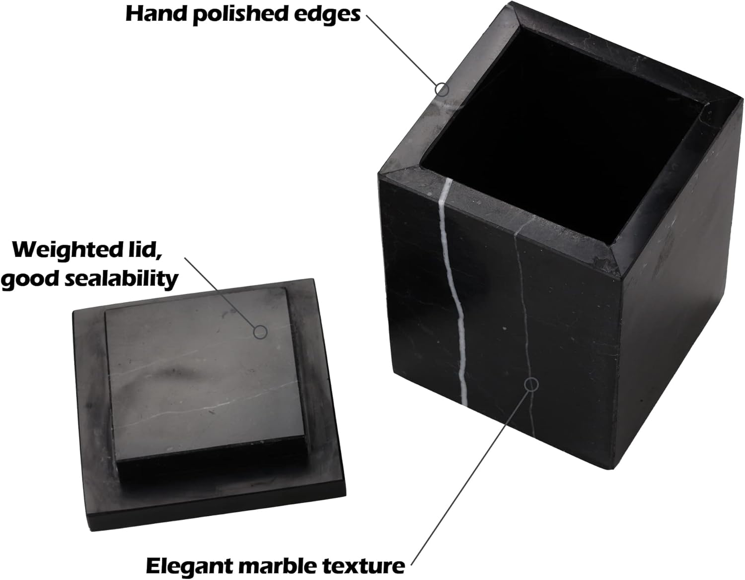 WORHE Marble Canister Natural Stone Qtip Holder with Lid Square Bathroom Vanity Organizer for Makeup Sponge Coffee Bean Dispenser Storage Jar Case for Home Decor Black (DLB202)
