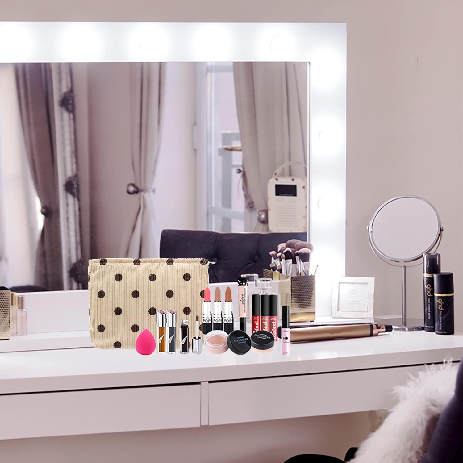 PAZIMIIK Makeup Bag Large Zipper Corduroy Make Up Pouch for Purse Travel Canvas Cosmetic Organizer for Women Brush Storage,Polka Dot Beige