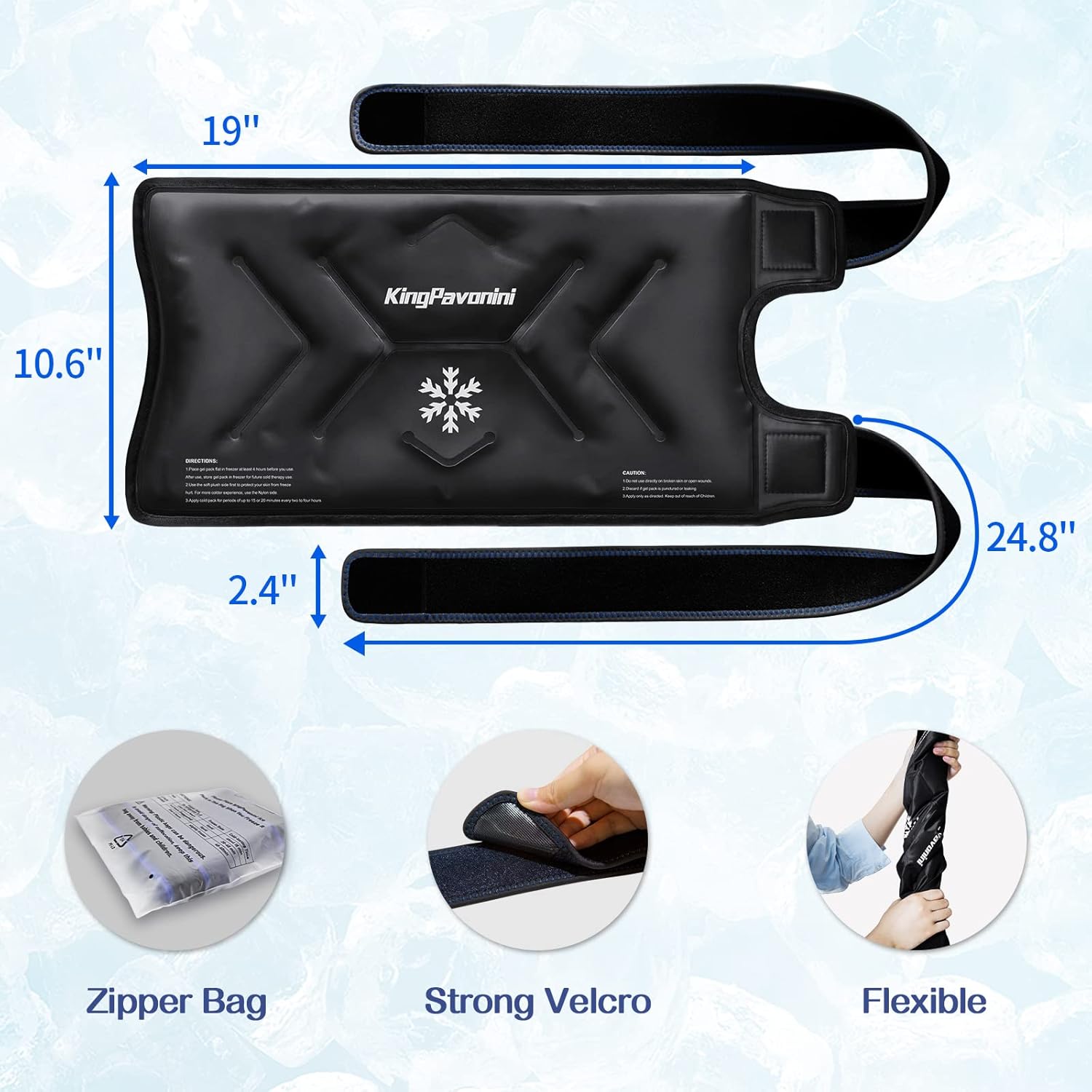 - Plus Size Knee Ice Pack: Measures 19"X10.6" with 24.8" elastic straps, large ice pack ensures a full coverage for your knees, which is available for knee circumference up to 19". Two adjustable straps make gel ice pack more fit your knee and add compression, securing in place to free your hands.