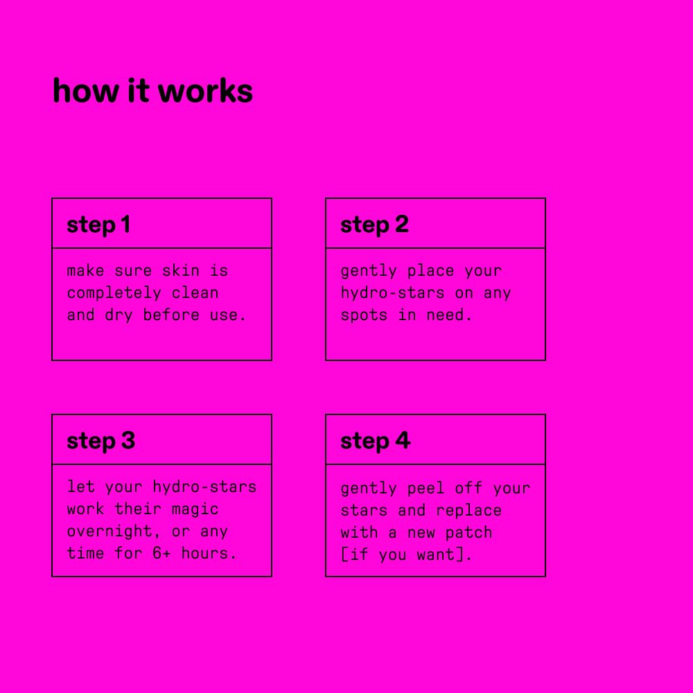 - CUTE & EFFECTIVE: A star-shaped pimple patch that's out of this world. Made with 100% hydrocolloid to help absorb fluid, reduce redness, and shrink spots while looking cute.