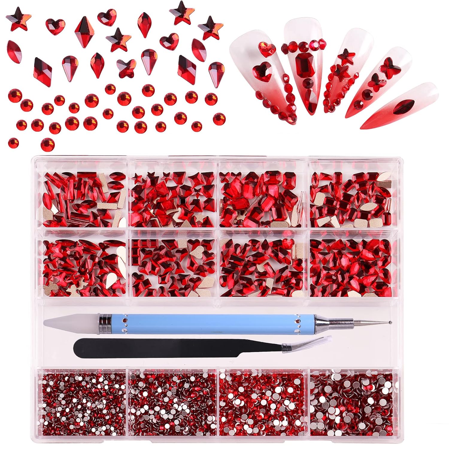 HOINCO 3320Pcs Multi-Shaped Crystal Red Nail Rhinestones & Gems for DIY Nail Art