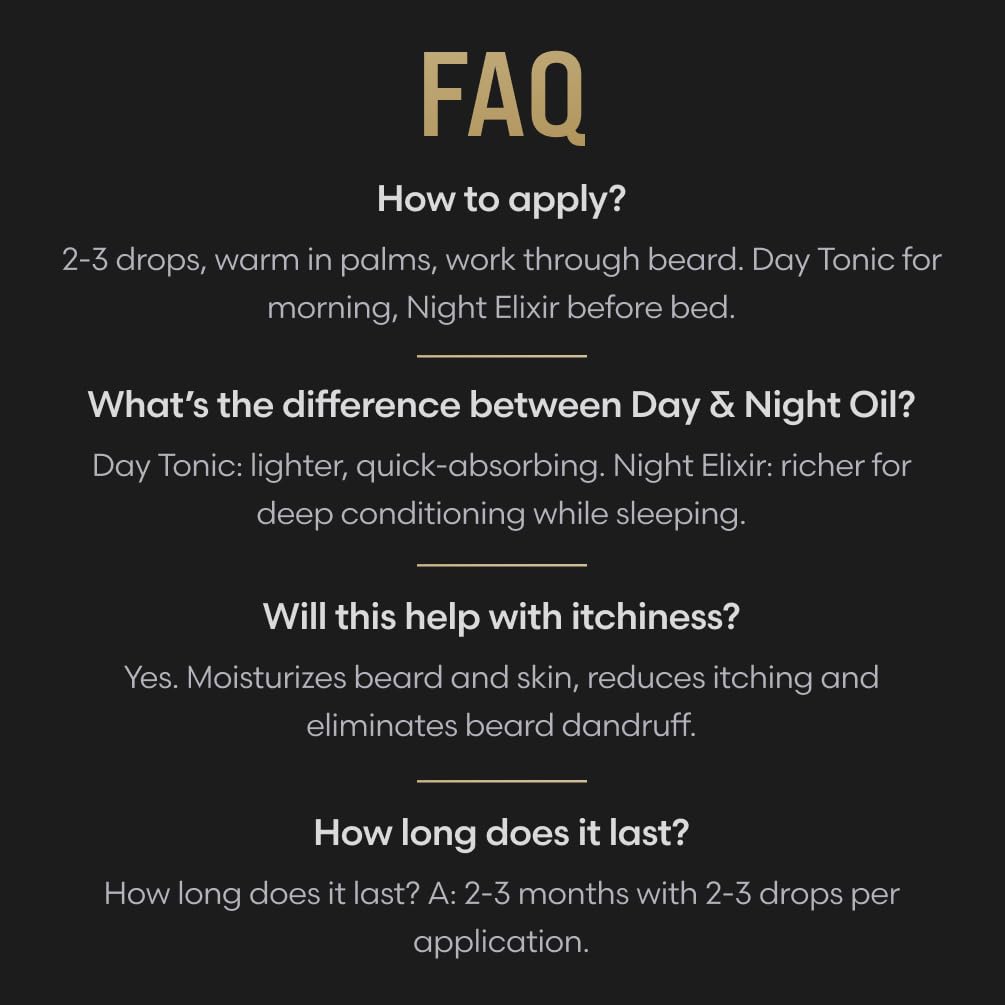 - Night Liquid Elixir for Extra Softness: Elevate your beard care with our all-in-one solution! The Night Elixir targets brittleness and split ends of the beard, deeply moisturizing for a smoother, healthier beard by morning. Boost your beard shine with our beard growth oil for men, your skin will be nourished & beard will be soft and sleek!