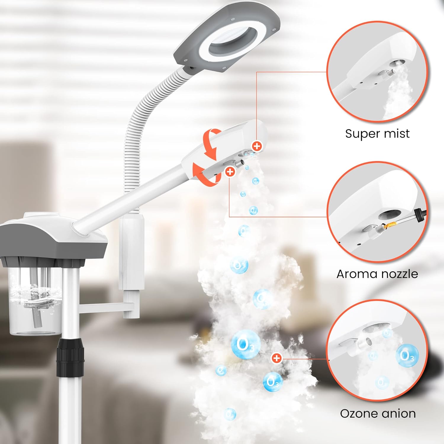 - Adjustable And Flexible: Face steamer for facial deep cleaning with len can be rotated 360 degrees and flipped 180 degrees up and down. It can be flexibly adjusted according to the desired height combined with the position of the arm, and maintain the appropriate distance so that any part of the body can better receive the water mist