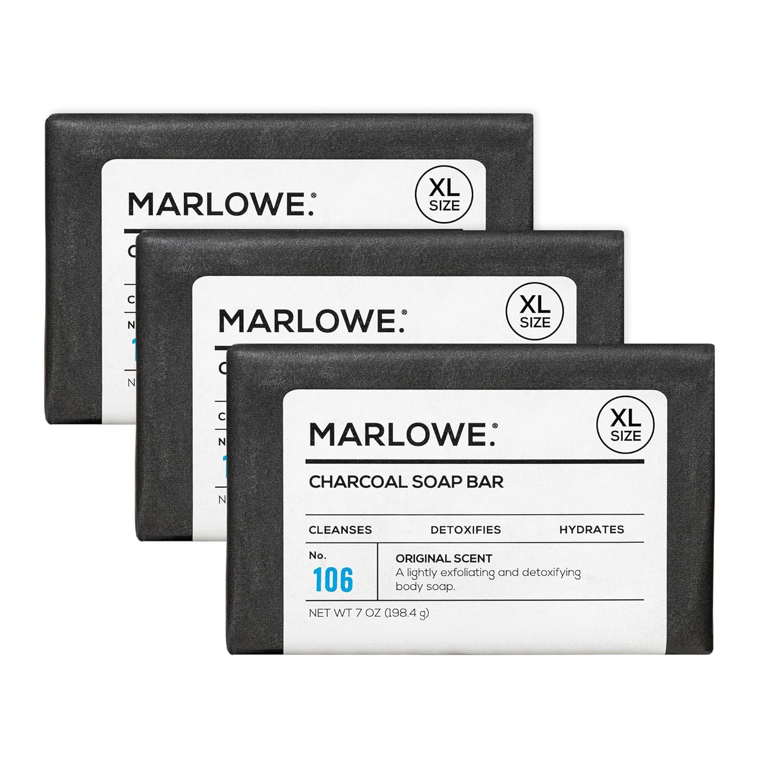MARLOWE. No. 106 Charcoal Soap 7 oz (3 Bars) Body Bar Soap for Men, Cleansing, Purifying & Hydrating with Natural Extracts, Shea Butter, Olive Oil & Green Tea Extracts, Fresh Woodsy Scent