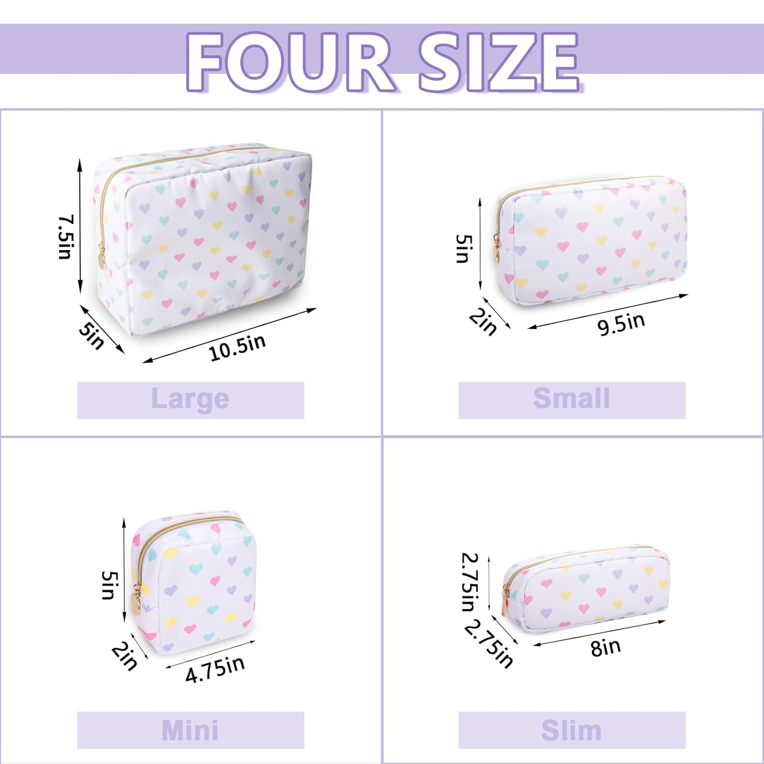 - 【Multiple Options】The waterproof makeup bag has four sizes, Mini(4.75''*2''*5''), Small(9.5''*2''*5''), Large(11''*5''*8'') and Slim(2.75*8''*2.75''). You can choose the right size according to the items you want to store. We have four types of patterns, Pink Heart, Houndstooth, Checkerboard grid and White Heart. You can enjoy choosing the pattern you like.
