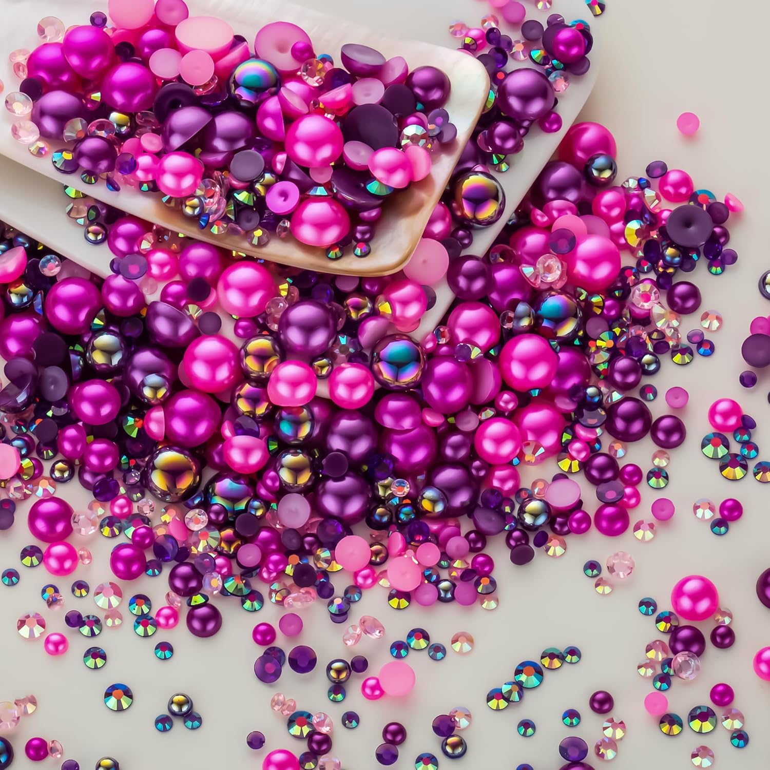 - Assortment Sizes: The flatback half pearls come in a mixture of colors and sizes of 3/4/5/6/8/10mm. The flatback rhinestones are resin rhinestones in sizes of 2/3/4/5/6mm. These mixes are such a great way to get an assortment of colors and sizes without having to buy each item individually