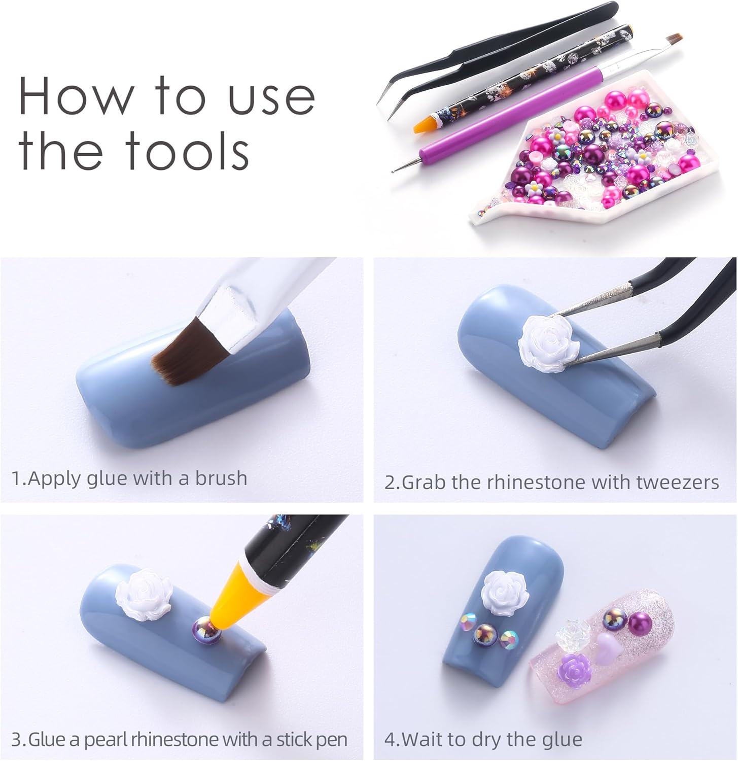 - Useful tools - These pearls and rhinestones have a flat back, which is excellent for easy placement.and you can pick up any large or small pearls and rhinestones with the crayons we bring along. And use the brush to smooth out the Gel, these tools will work very well