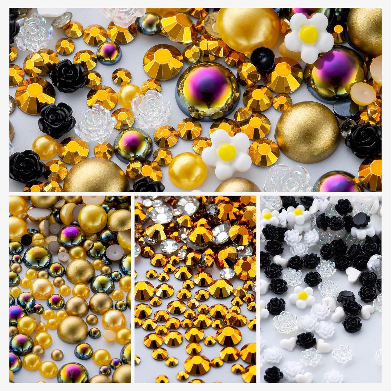 - Assortment Sizes: The flatback half pearls come in a mixture of colors and sizes of 3/4/5/6/8/10mm. The flatback rhinestones are resin rhinestones in sizes of 2/3/4/5/6mm. These mixes are such a great way to get an assortment of colors and sizes without having to buy each item individually