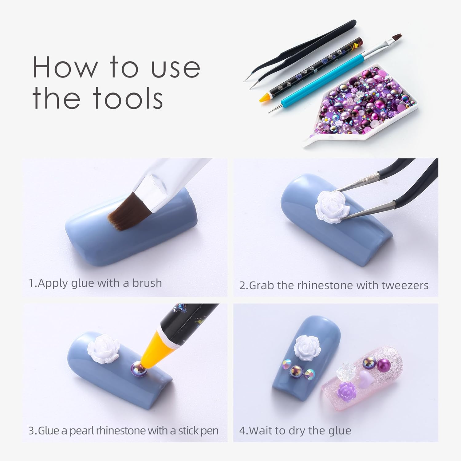 - đź’ŽUseful tools - These pearls rhinestones have a flat back, which is excellent for easy placement.and you can pick up any large or small pearls and rhinestones with the crayons we bring along. And use the brush to smooth out the glue, these tools will work very well.