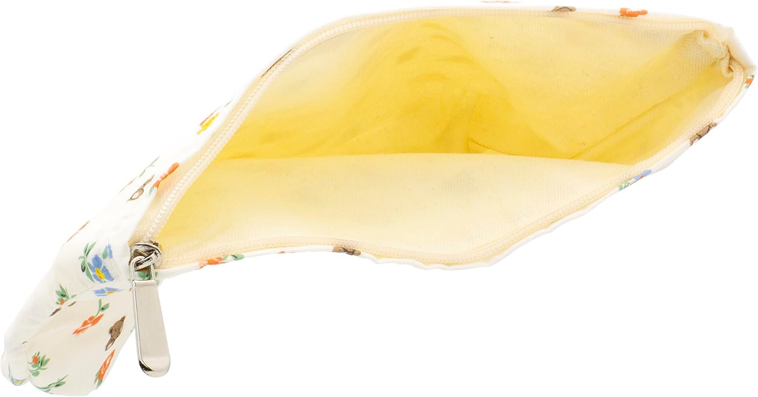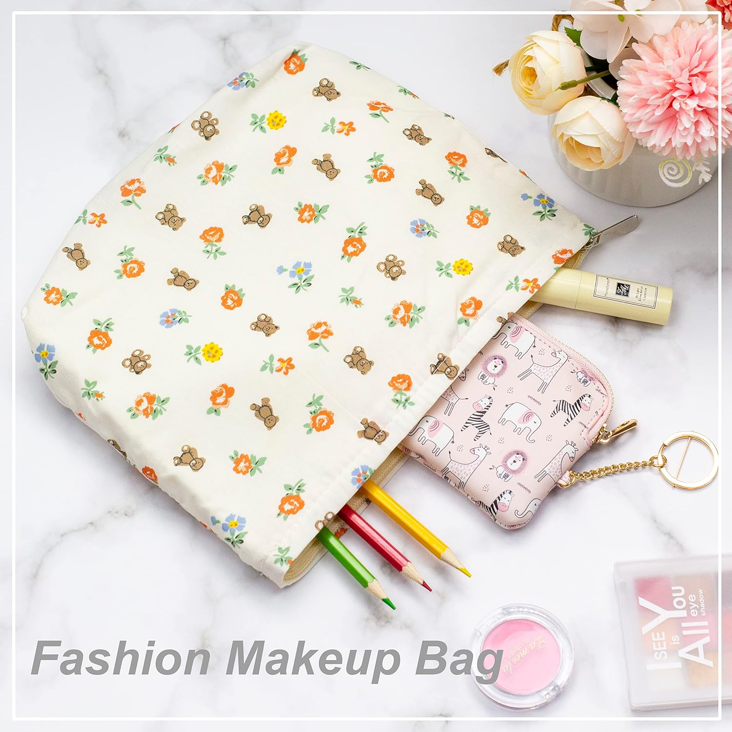 PAZIMIIK Floral Makeup Bag Large Cotton Zipper Pouch for Purse Travel Canvas Make Up Organizer for Women Cosmetic,Flower Bear White
