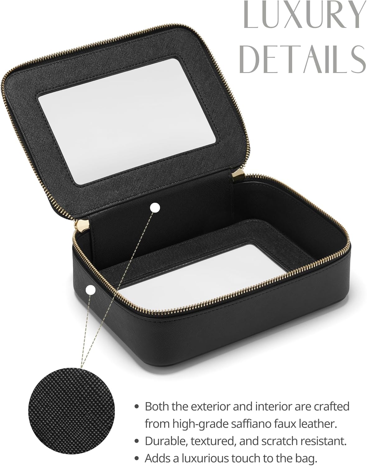 • [Premium Material and Durability] – The clear cosmetic case, both the exterior and interior, is crafted from high-grade saffiano faux leather, which is highly scratch resistant, durable and exceptionally easy to keep clean. It features a smooth zipper for secure closure, and elegant light gold metal hardware accents, adding a luxurious and sophisticated touch to the bag's overall design.