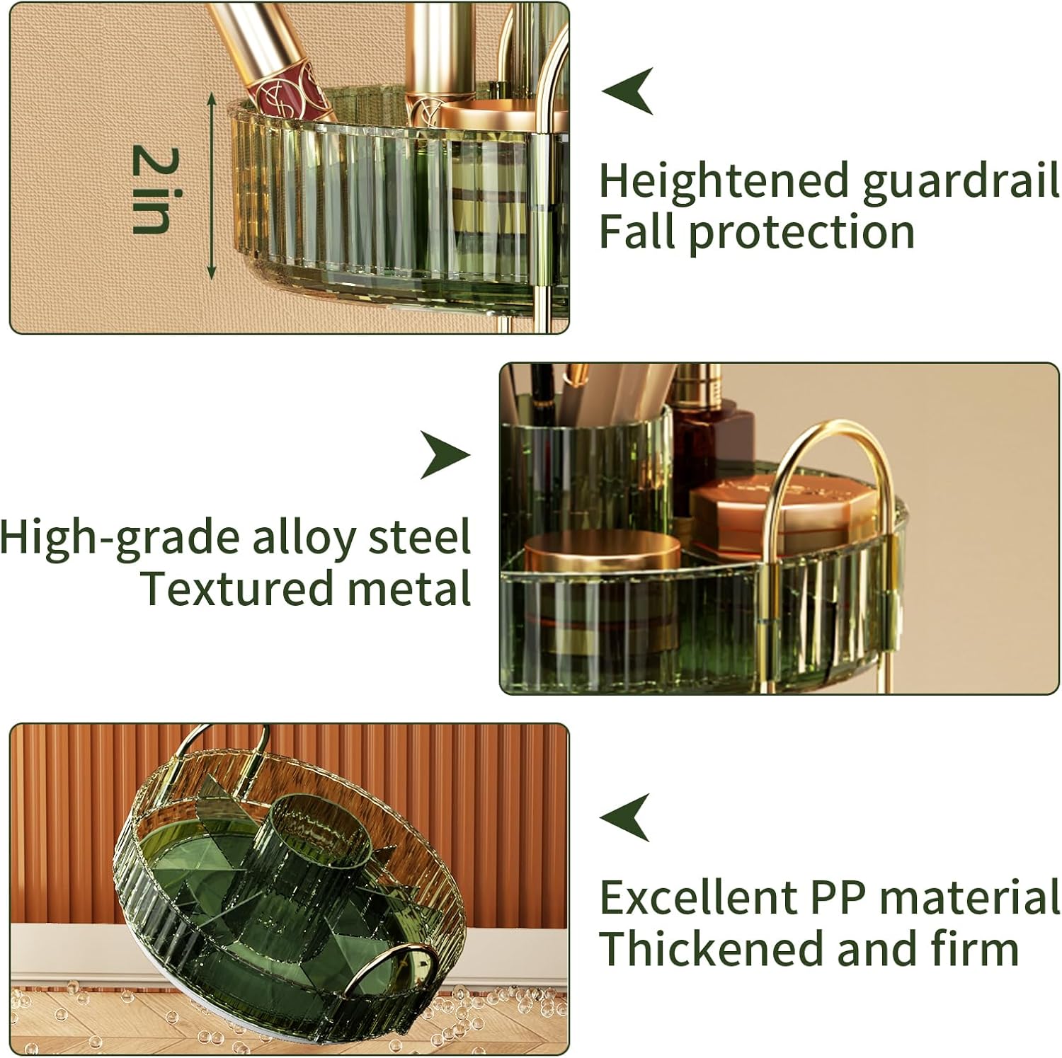 - 【360° Rotation】: The large-capacity makeup organizer allows you to store your cosmetics and skincare products in a clean and orderly space, 360° smooth rotation allows you to quickly find what you need, It's very convenient. The raised edges prevent cosmetics from falling off during rotation.