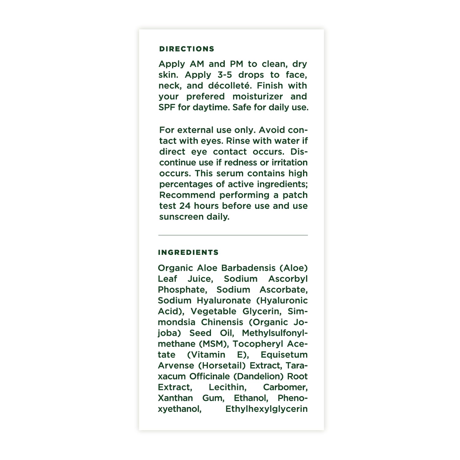 - Directions: Apply AM and PM to clean, dry skin. Apply 3-5 drops to face, neck, and decollete. Finish with your preferred moisturizer or SPF for daytime. Safe for daily use.