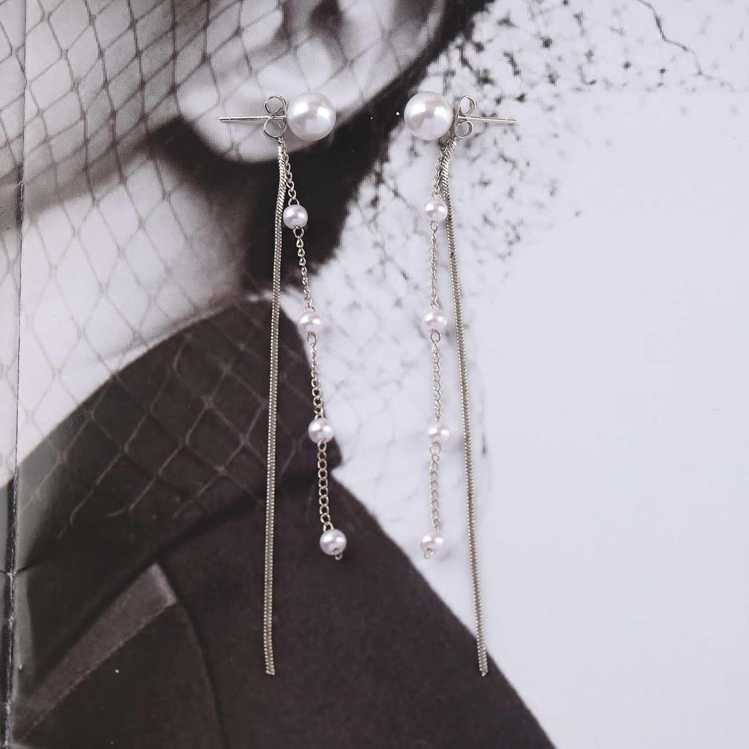 - Pearl chain drop earrings.Item Details:Handmade Item.Size:As Shown.Color:Silver.Materials:Quality Alloy/Pearl.Location:Ear.Style:Boho/Vintage.