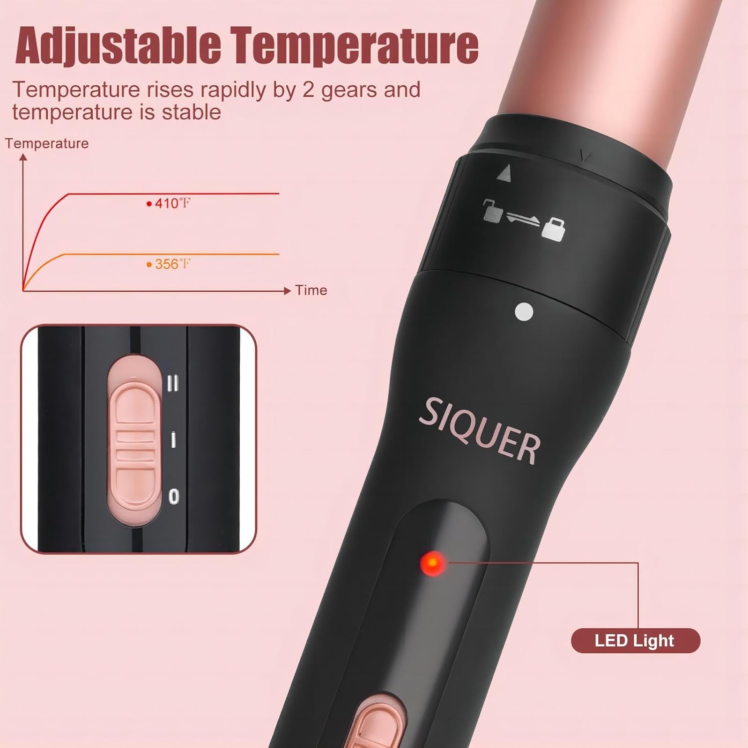 - Heats Up Fast - The hair curling wand designed at 2 temperatures -can reach 410° F within (3 mins), ranges from 356° F to 410° F. Lower temperature for fine and soft hair; Higher temperature for thick and coarse hair.
