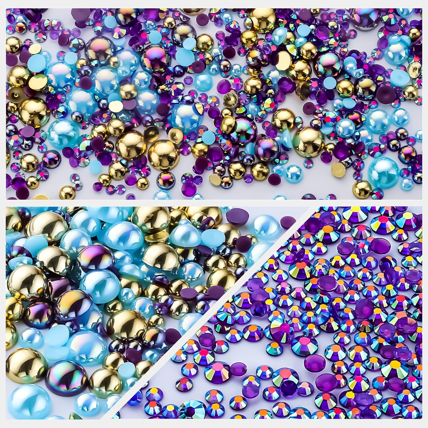 - Assortment Sizes: The flatback half pearls come in a mixture of colors and sizes of 3/4/5/6/8/10mm. The flatback rhinestones are resin rhinestones in sizes of 2/3/4/5/6mm. These mixes are such a great way to get an assortment of colors and sizes without having to buy each item individually