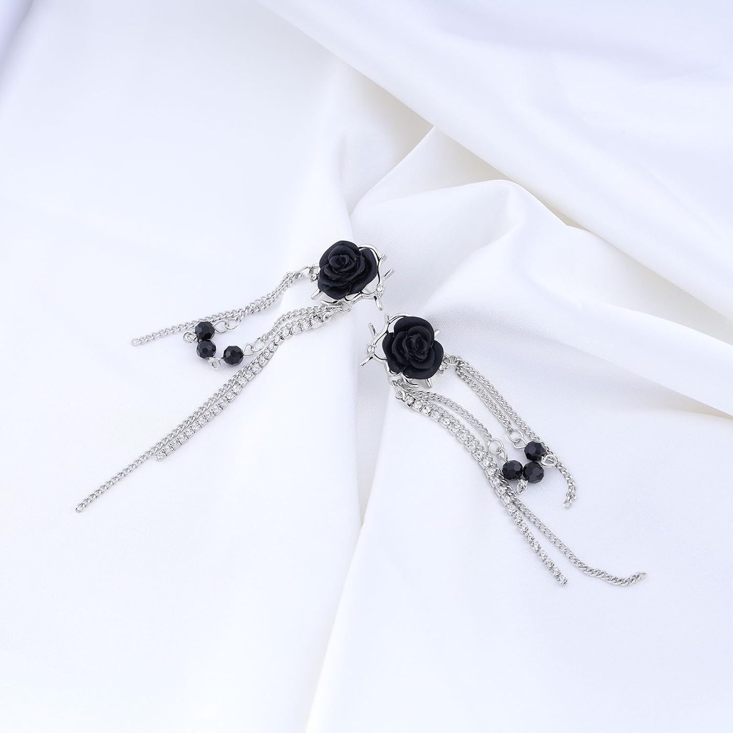 Punk Black Rose Flower Earring Long Rhinestone Chain Drop Earrings Silver Cz Tassel Chain Earrings Black Rose Flower Ear Cuff Earring Jewelry for Women