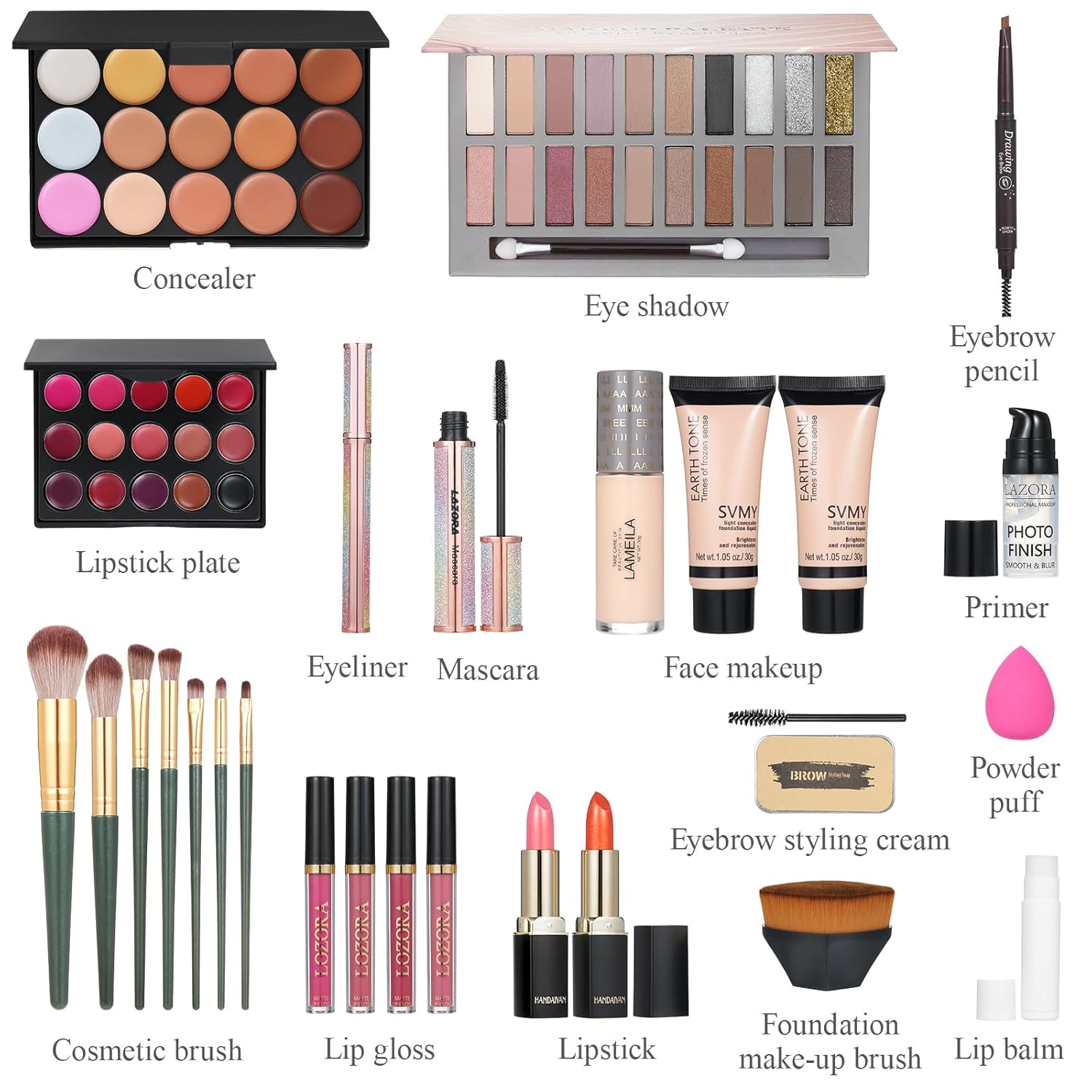 - 【All In One Makeup Kit】 Contains a wide variety of shades and styles, to let you find the look that suits you best. This cosmetics include Eyeshadow, Concealer, Liquid Foundation, Face Makeup, Lipstick Plate, Lip Gloss, Lipstick, Eyebrow Pencil, Eyebrow Styling Cream, Mascara,Eyeliner Foundation Makeup Brush, Powder Puff, Lip Balm, Primer, Cosmetic Brush, Makeup Kit Box, Gift Box.The most sweetest present for your beloved. All women's essentials in one elegant box