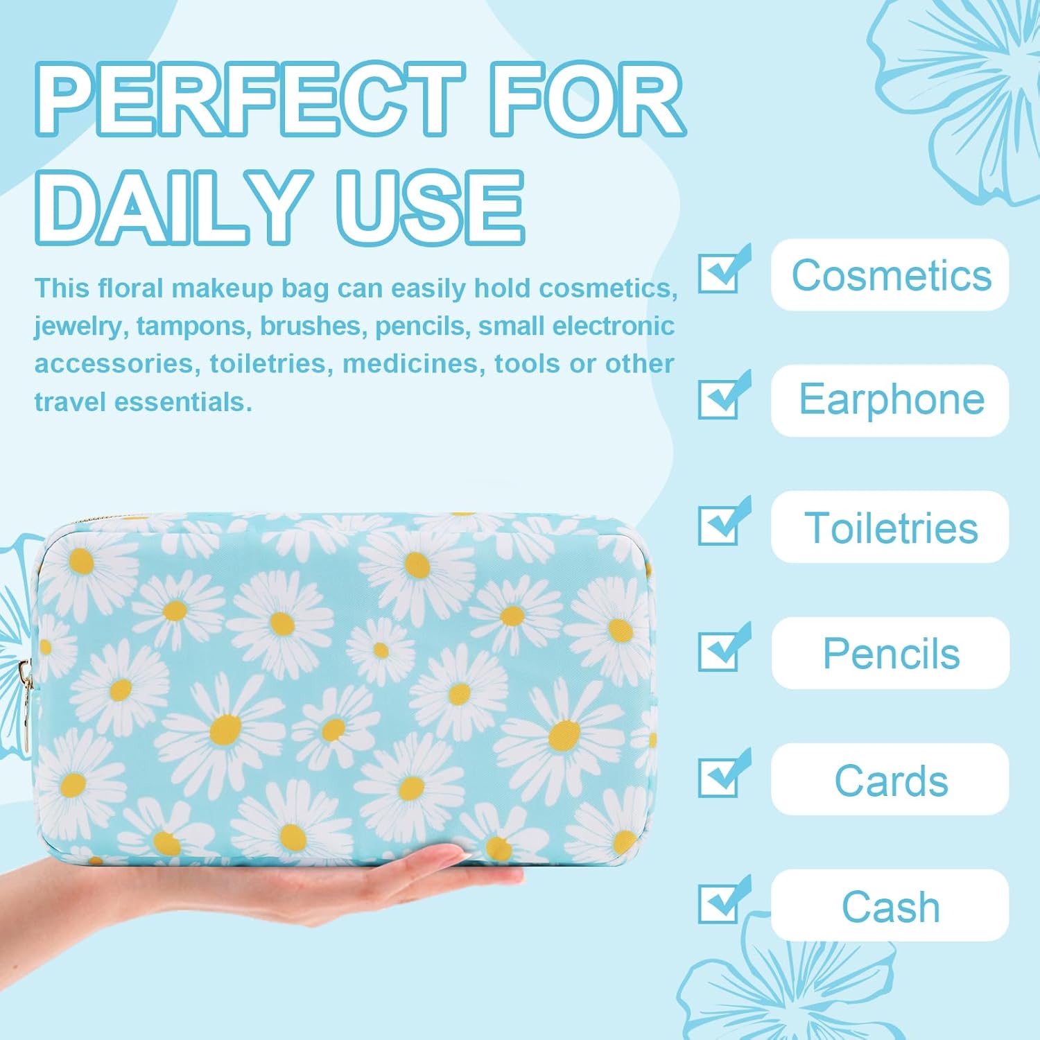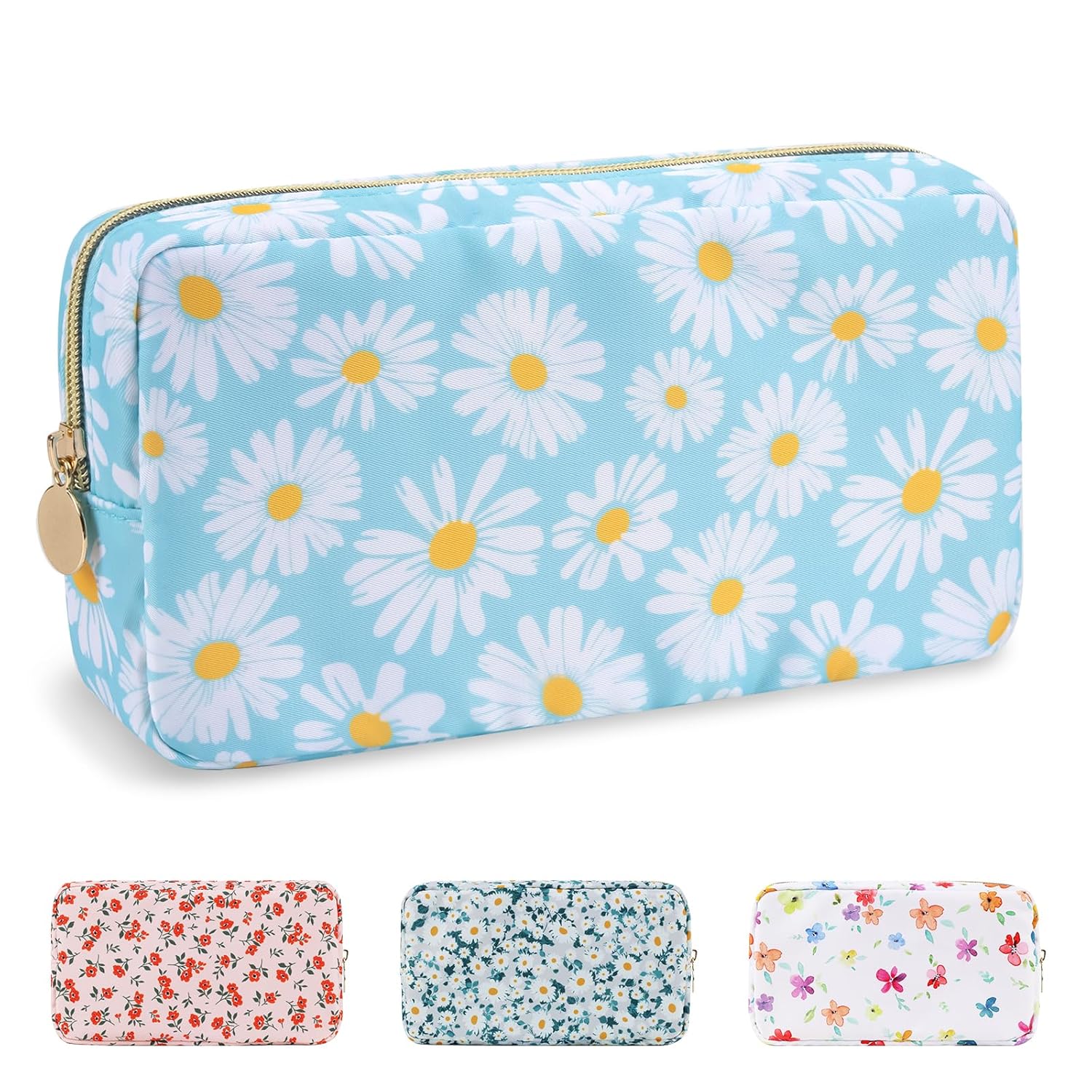 Waterproof Small Floral Makeup Bag Pouch for Purse,Nylon Flower Cosmetic Bag Preppy Travel Toiletry Storage Bag for Women Girl,Cute Makeup Organizer Bag Skincare Bag with Zipper(Small Blue-Daisy)